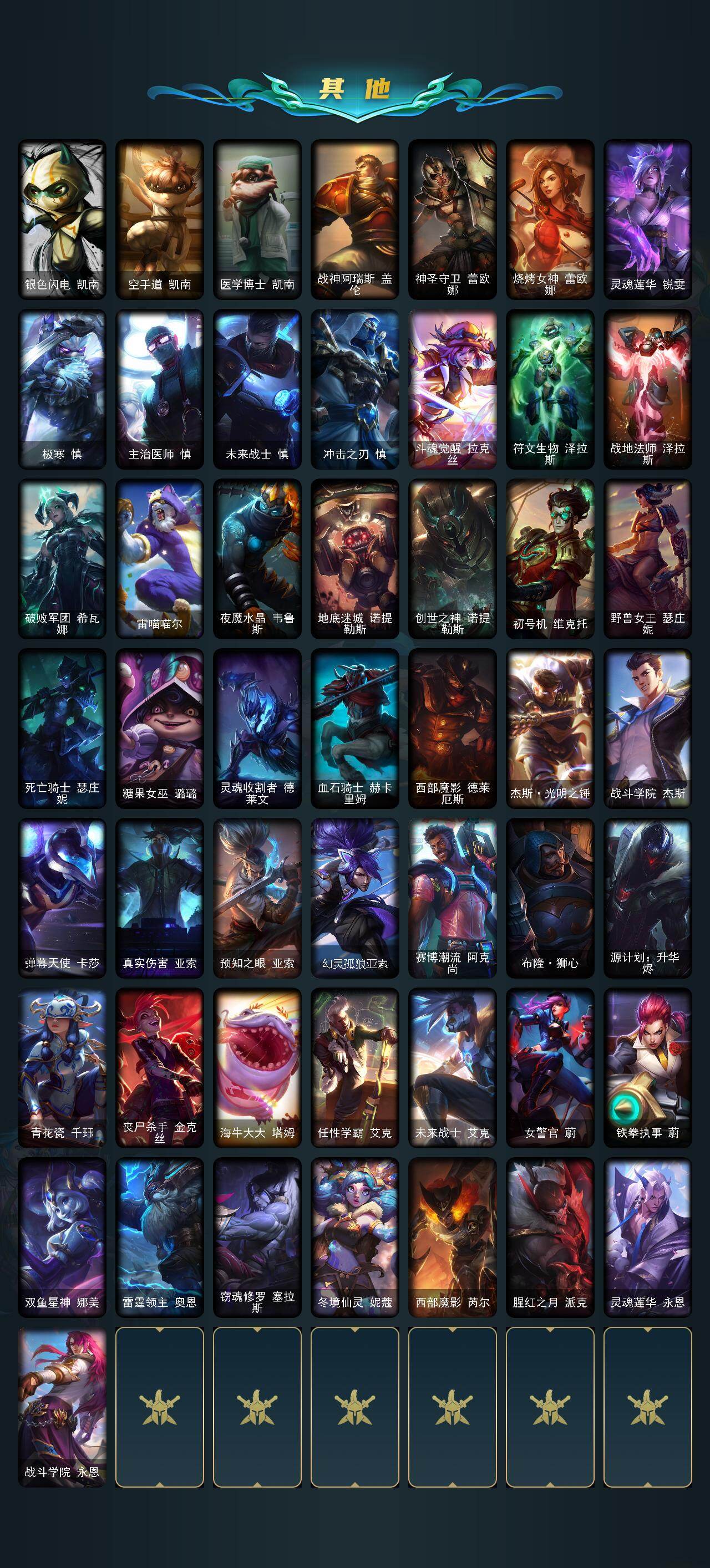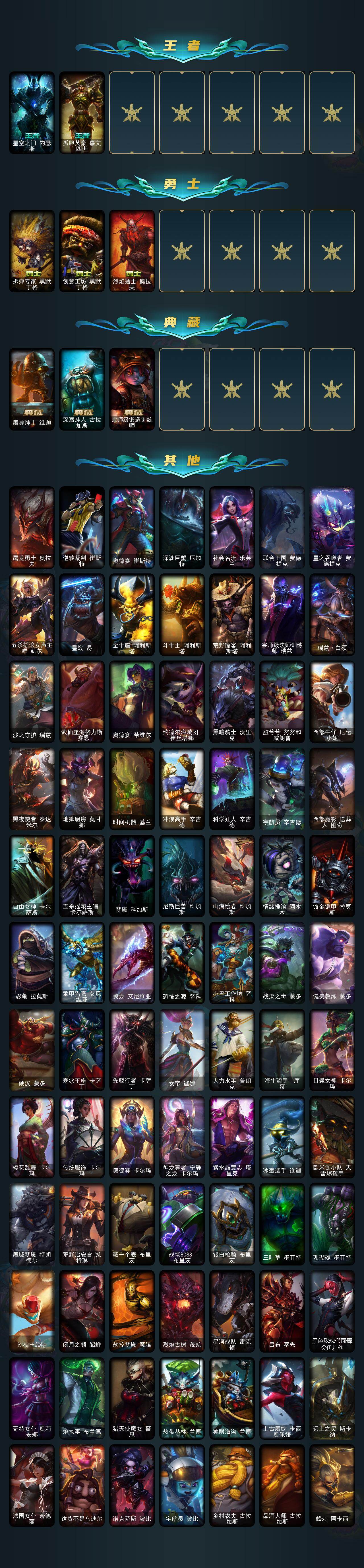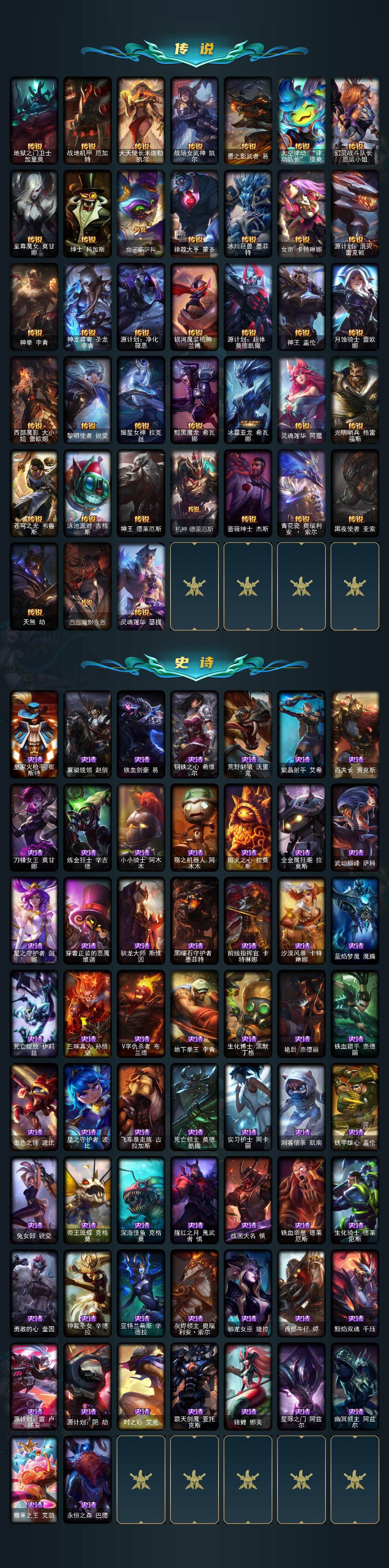 【传说皮肤】:地狱之门卫士加里奥,战地机甲厄加特,大天使长米迦勒凯尔,战场女武神凯尔,墨之影武者易,太空律动律动队长提莫,幻灵战斗队长厄运小姐,至尊魔女莫甘娜,绅士科加斯,盒子猫萨科,律政大亨蒙多,冰川巨兽墨菲特,女帝卡特琳娜,源计划泯灭雷克顿,神拳李青,神龙尊者圣龙李青,源计划净化薇恩,银河魔装机神兰博,源计划超体莫德凯撒,神王盖伦,月蚀骑士蕾欧娜,西部魔影大小姐蕾欧娜,黎明使者锐雯,耀星女神拉克丝,黯黑魔龙希瓦娜,冰霜亚龙希瓦娜,灵魂莲华阿狸,光明哨兵格雷福斯,苍穹之光韦鲁斯,泳池派对吉格斯,神王德莱厄斯,机神德莱厄斯,蔷薇绅士杰斯,青花瓷奥瑞利安索尔,黑夜使者亚索,天煞劫,西部魔影永恩,灵魂莲华瑟提