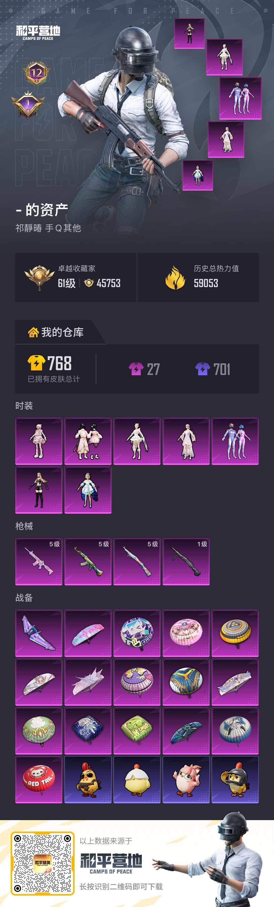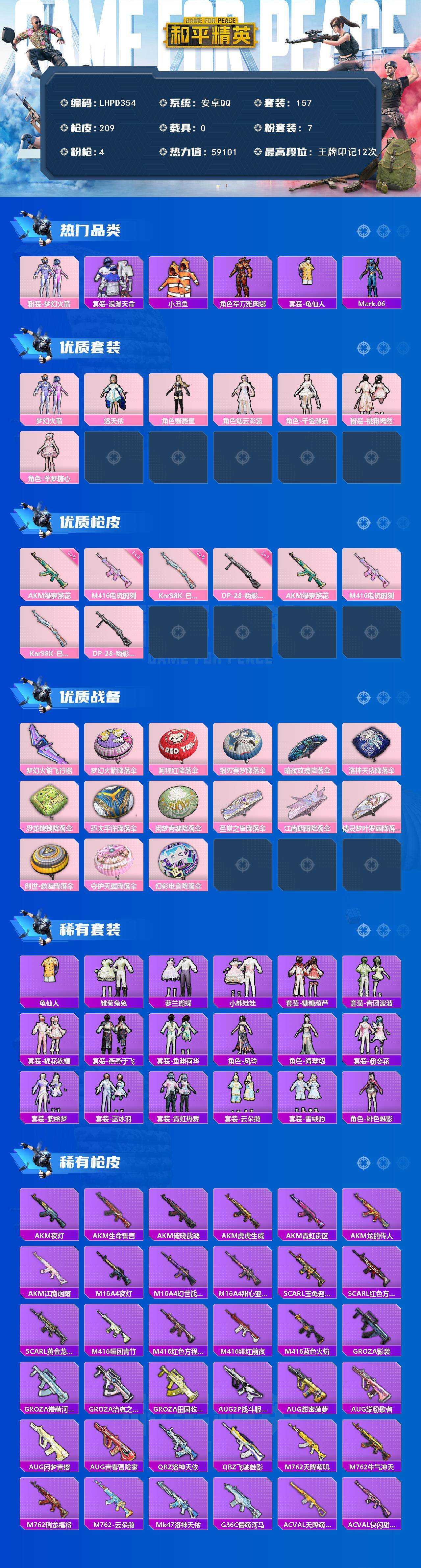 - [15144873]【店主推荐捡漏号!可直接换绑】安卓 手Q-无敌战神框-9粉装-14特效枪-4载具-3粉色飞行器-86790热力值-17王牌印记-177套装-240枪皮【热门品类】:粉装-雪国幻梦,粉装-梦幻火箭,套装-奇异狩猎者,套装-胖达圆圆,套装-浪客战士,套装-粉红小猪【粉色套装】:粉装-雪国幻梦,粉装-梦幻火箭,粉装-天禅智恒,粉装-彗云及圣,粉装-向日葵,粉装-甜蜜誓约,粉装-俏皮狐尾,粉装-暗夜玫瑰,角色-千金淑猫【粉色枪皮等级】:AKM-炫紫旋律(五级),SCAR-L-梦幻火箭(五级),M416-五爪金龙(七级),M416-心之恋语(七级),M416-电玩时刻(四级),GROZA-镜光银凌(五级),M762-甜蜜誓约(五级),M762-激战未来(一级),UMP45-量子极限(五级),Kar98K-伏魔团(四级),Kar98K-巳巳如意(五级),AWM-花间之火(五级),Mk14-甜梦熊击(五级),MG3-洛神天依(五级)【粉色载具】:兰博基尼Estoque(银翼灰),阿斯顿马丁DBX(橙),幽澜尊爵(静谧蓝),合金龙骨(蓝)【粉色枪皮】:AKM-炫紫旋律,SCAR-L-梦幻火箭,M416-五爪金龙,M416-心之恋语,M416-电玩时刻,GROZA-镜光银凌,M762-甜蜜誓约,M762-激战未来,UMP45-量子极限,Kar98K-伏魔团,Kar98K-巳巳如意,AWM-花间之火,Mk14-甜梦熊击,MG3-洛神天依【粉色飞行器】:梦幻火箭飞行器,炫紫旋律飞行器,齐天大圣飞行器