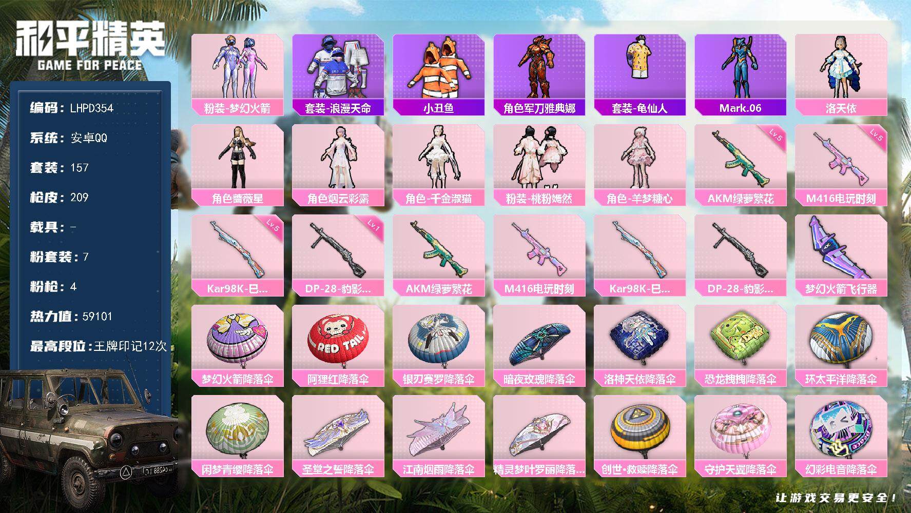 [16696060]【店主推荐捡漏号!可直接换绑】安卓 手Q-7粉装-4特效枪-0载具-1粉色飞行器-59101热力值-12王牌印记-157套装-209枪皮【热门品类】:粉装-梦幻火箭,套装-浪漫天命,套装-小丑鱼,角色-军刀雅典娜,套装-龟仙人,角色-Mark.06【粉色套装】:粉装-梦幻火箭,角色-洛天依,角色-蔷薇星,角色-烟云彩露,角色-千金淑猫,粉装-桃粉嫣然,角色-羊梦糖心【粉色枪皮等级】:AKM-绿萝繁花(五级),M416-电玩时刻(五级),Kar98K-巳巳如意(五级),DP-28-豹影疾电(一级)【粉色枪皮】:AKM-绿萝繁花,M416-电玩时刻,Kar98K-巳巳如意,DP-28-豹影疾电【粉色飞行器】:梦幻火箭飞行器