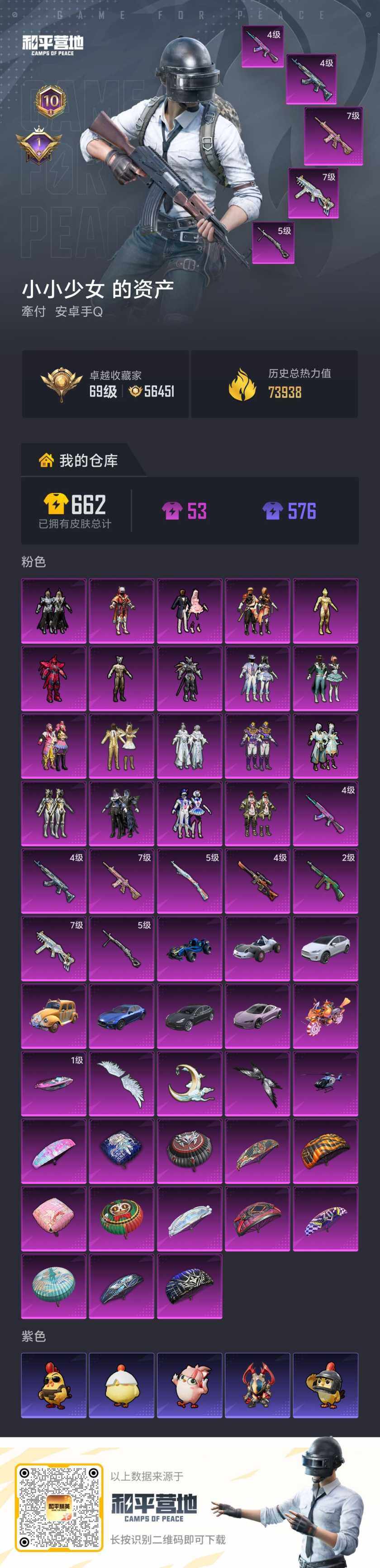 - PX_2096543- 安卓手Q-7王牌印记-有战神框-1粉装-3特效枪-1载具-32845热力值-62套装-106枪皮-4卓越印记-3传奇印记 【1粉装】,星穹咏叹调 【3特效枪】SCAR-L-锦绣绵绵-5级 M416-女娲灵识-3级 Kar98K-巳巳如意-5级 【5稀有紫装】,派对舞王,暗影哥特,浪漫天命,龟仙人,怀庆长公主, 【1稀有载具】,护世瑞兽, 【62稀有时装】,SS31特训,S