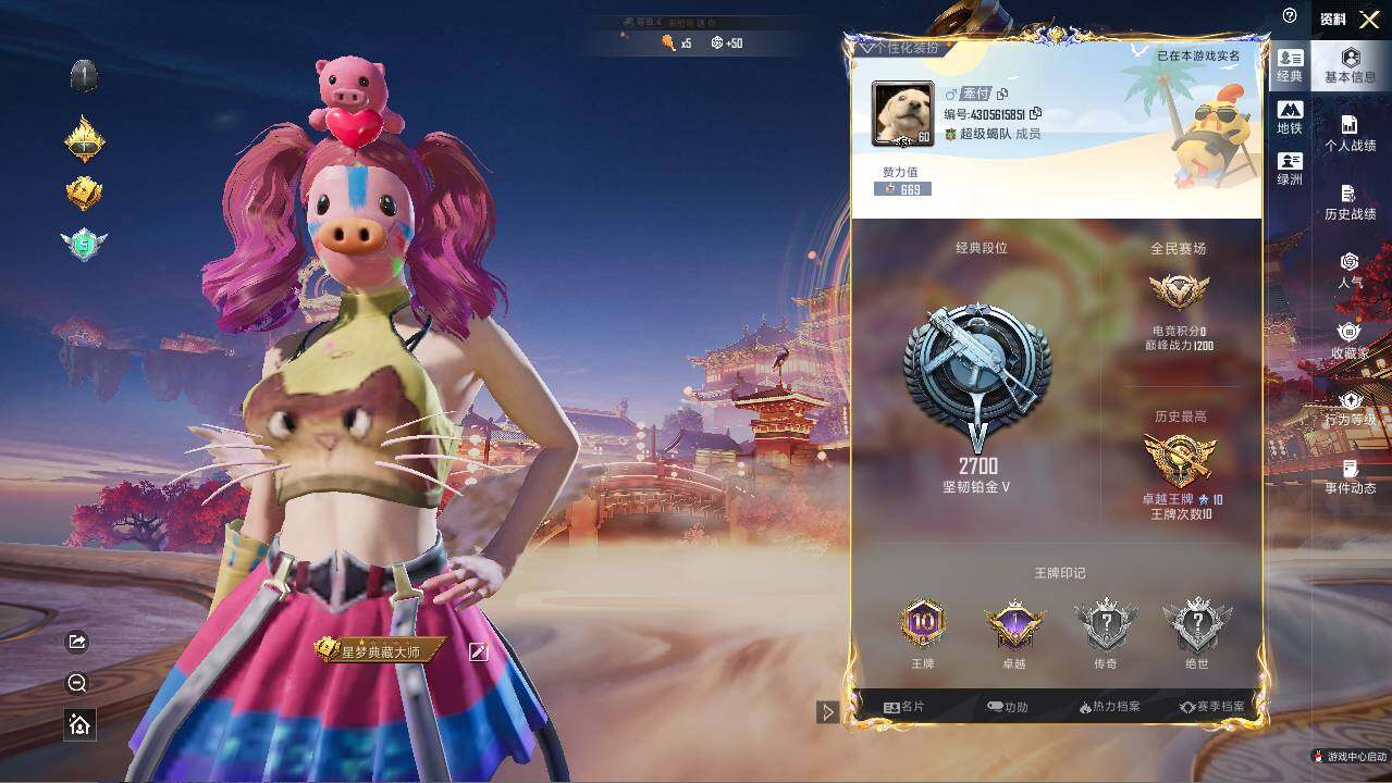 - [13594324]实名: 可修改 时装数: 469 枪械数: 138 战备数: 97 热门装扮: 光极星,绯穹魔姬 稀有枪皮: M416电玩时刻,P90-金丰海韵,Kar98K-巳巳如意,DP-28-豹影疾电