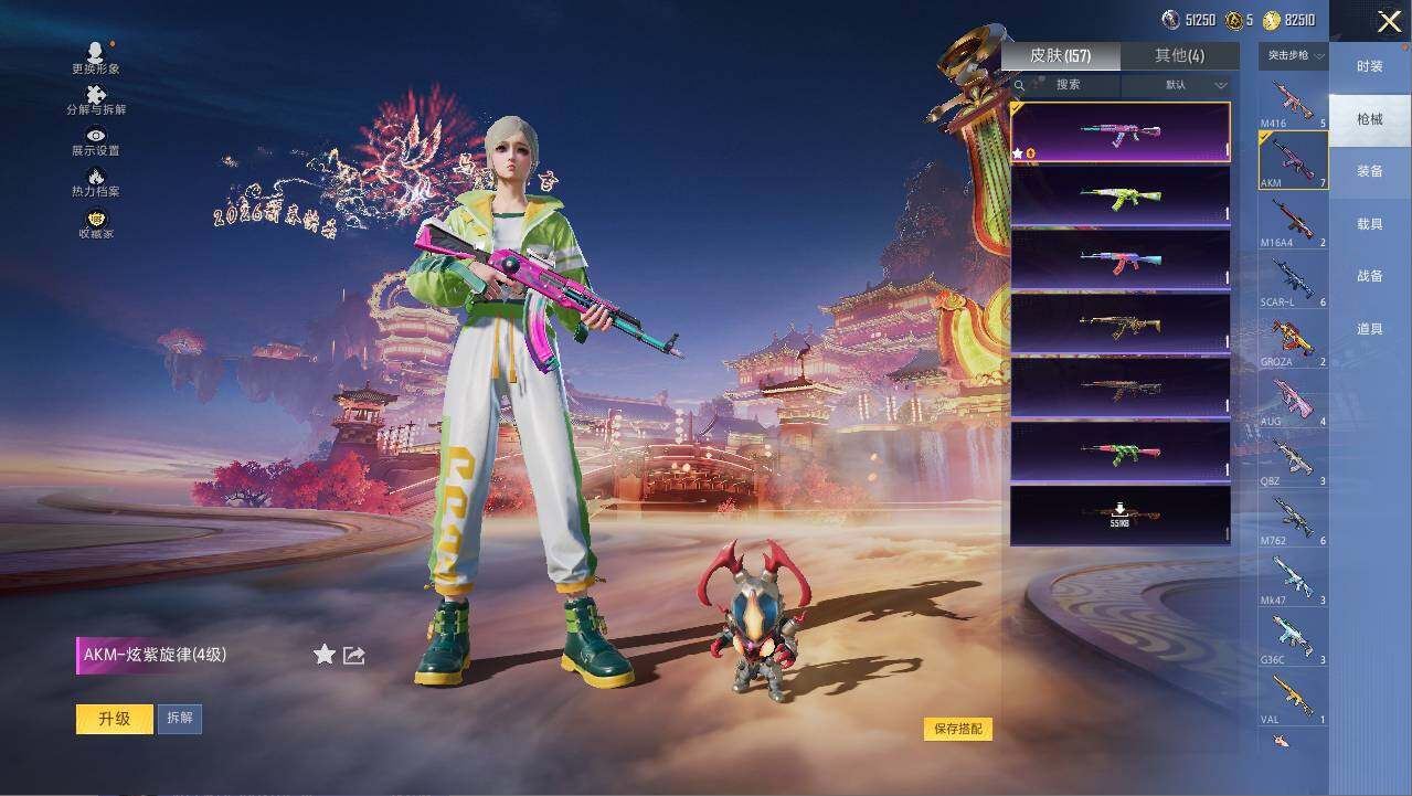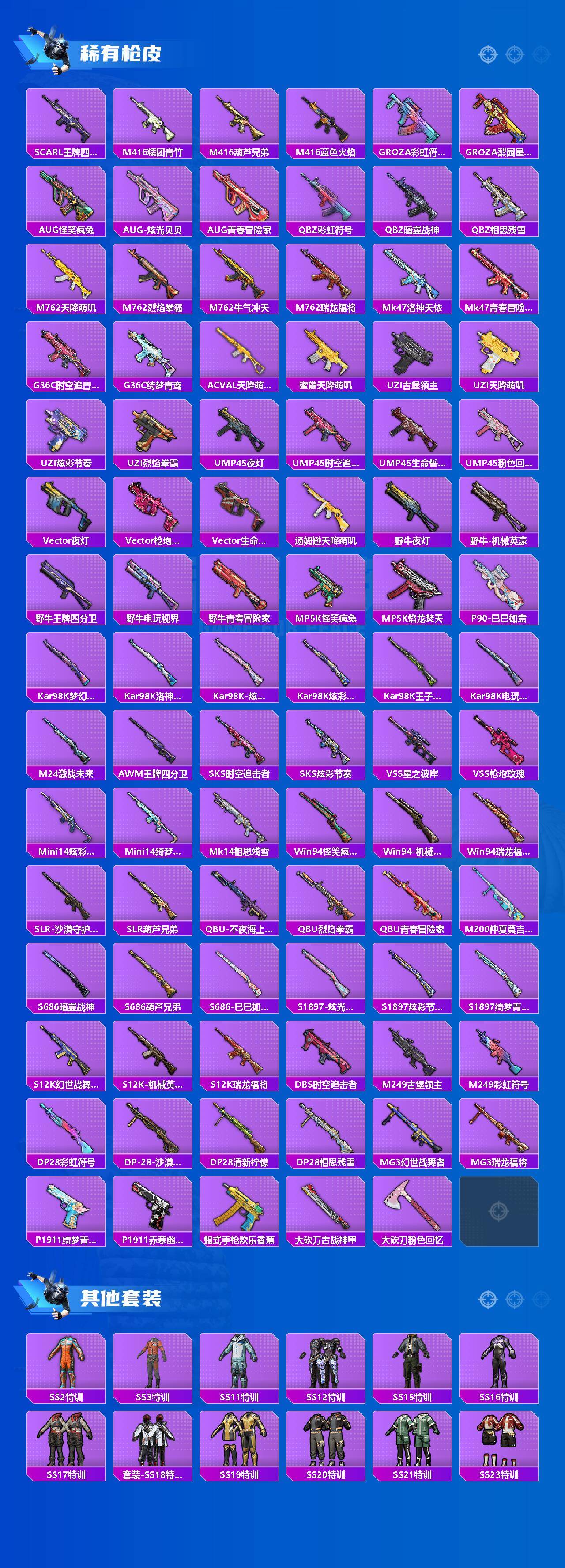 AKM-炫紫旋律,M416-心之恋语,M762-激战未来,UMP45-相思残雪,汤姆逊-怪笑疯兔,Kar98K-巳巳如意,VSS-烈焰拳霸