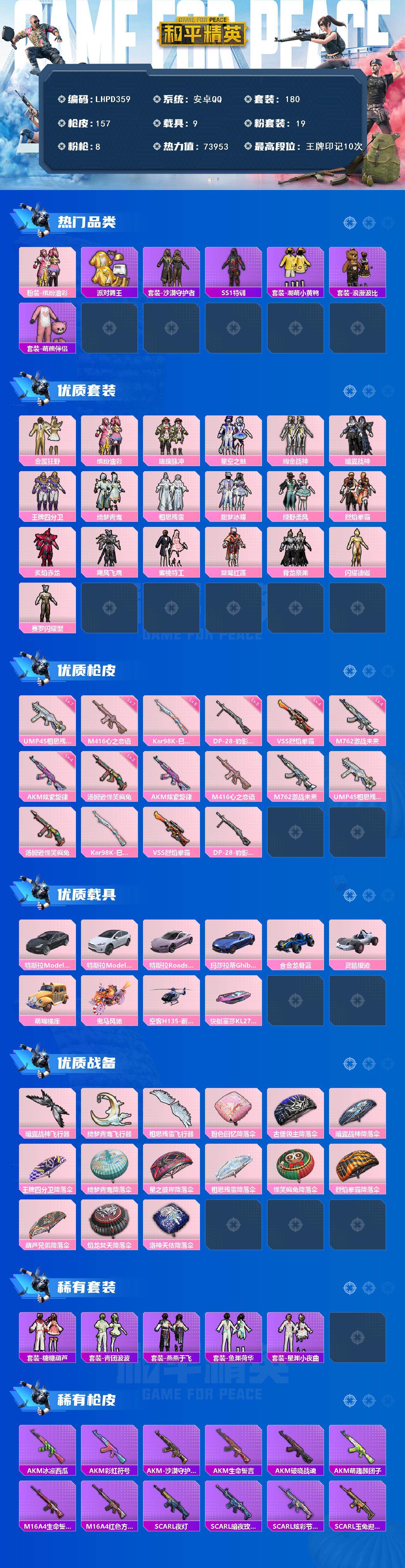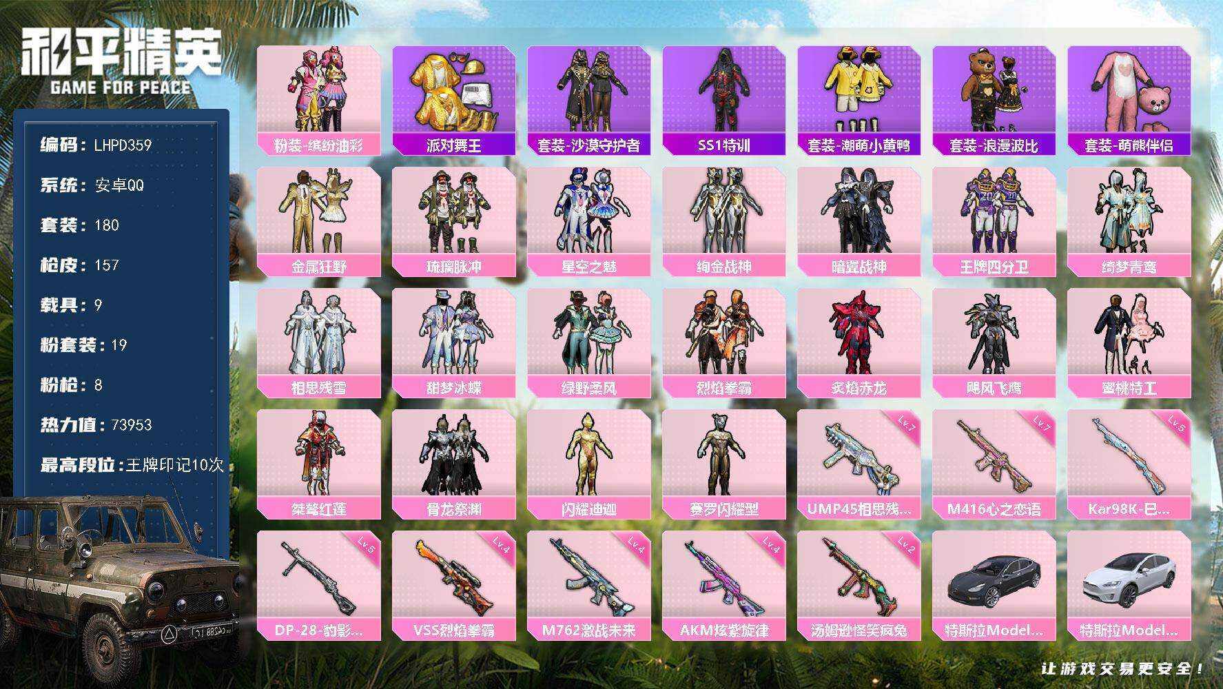[16736161]【特价出售/店主推荐】安卓 手Q-19粉装-8特效枪-10载具-3粉色飞行器-73953热力值-10王牌印记-180套装-157枪皮【热门品类】:粉装-缤纷油彩,套装-派对舞王,套装-沙漠守护者,套装-SS1特训,套装-潮萌小黄鸭,套装-浪漫波比,套装-萌熊伴侣【粉色套装】:粉装-金属狂野,粉装-缤纷油彩,粉装-琉璃脉冲,粉装-星空之魅,粉装-绚金战神,粉装-暗翼战神,粉装-王牌四分卫,粉装-绮梦青鸾,粉装-相思残雪,粉装-甜梦冰蝶,粉装-绿野柔风,粉装-烈焰拳霸,粉装-炙焰赤龙,粉装-飓风飞鹰,粉装-蜜桃特工,粉装-桀骜红莲,粉装-骨龙祭渊,角色-闪耀迪迦,角色-赛罗闪耀型【粉色枪皮等级】:AKM-炫紫旋律(四级),M416-心之恋语(七级),M762-激战未来(四级),UMP45-相思残雪(七级),汤姆逊-怪笑疯兔(二级),Kar98K-巳巳如意(五级),VSS-烈焰拳霸(四级),DP-28-豹影疾电(五级)【粉色载具】:特斯拉Model 3(冷光银),特斯拉Model X(珍珠白),特斯拉Roadster(沁心粉),玛莎拉蒂Ghibli(蓝),合金龙骨(蓝),灵鼠银迹,萌喵橘座,鬼马风驰,空客H135-蔚蓝之翼,快艇-塞莎KL27(霓虹粉)【粉色枪皮】:AKM-炫紫旋律,M416-心之恋语,M762-激战未来,UMP45-相思残雪,汤姆逊-怪笑疯兔,Kar98K-巳巳如意,VSS-烈焰拳霸,DP-28-豹影疾电【粉色飞行器】:暗翼战神飞行器,绮梦青鸾飞行器,相思残雪飞行器