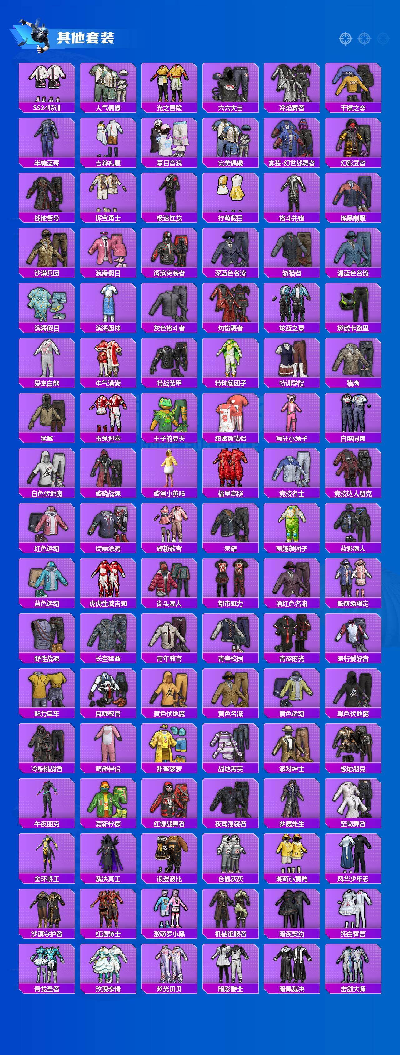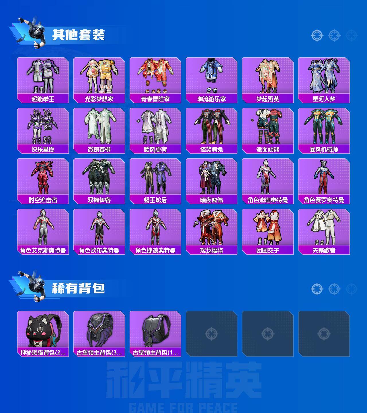 套装-缤纷油彩,套装-派对舞王,套装-沙漠守护者,套装-潮萌小黄鸭,套装-浪漫波比,套装-萌熊伴侣,套装-金属狂野,套装-琉璃脉冲,套装-星空之魅,套装-绚金战神,套装-暗翼战神,套装-王牌四分卫,套装-绮梦青鸾,套装-相思残雪,套装-甜梦冰蝶,套装-绿野柔风,套装-烈焰拳霸,套装-炙焰赤龙,套装-飓风飞鹰,套装-蜜桃特工,套装-桀骜红莲,套装-骨龙祭渊,角色-闪耀迪迦,角色-赛罗闪耀型,套装-爱崽白熊,套装-梦魇先生,套装-仓鼠灰灰,套装-炫光贝贝