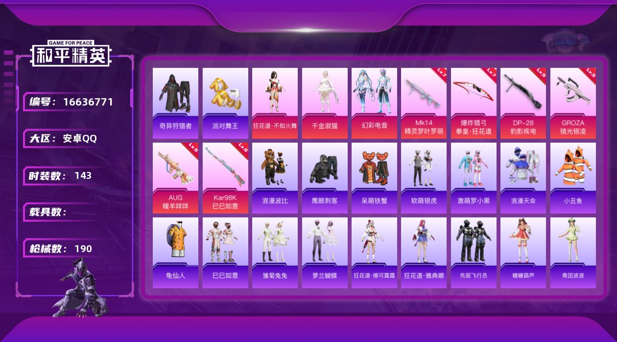 - [14018452]【1580】安卓 手Q-1神装-6粉装-11特效枪-1载具-8粉色飞行器-53024热力值-7王牌印记-94套装-159枪皮 【红色神装等级】:镜域双华-欧若拉(三级) 【红色角色神装】:镜域双华-欧若拉 【粉色载具】:黑曜夜骑 【粉色套装】:角色-狂花道·不知火舞,角色-萨利娅,粉装-幻彩电音,角色-奇迹舞步 美琪,角色-奇迹舞步 美雪,角色-羊梦糖心 【粉色枪皮等级】:M416-墨龙九天(三级),GROZA-镜光银凌(五级),AUG-暖羊咩咩(五级),M762-青锋波束(五级),蜜獾-荧海星豚(五级),Kar98K-巳巳如意(五级),Kar98K-圣域龙灵(二级),Mk14-甜梦熊击(五级),DP-28-千金淑猫(五级),DP-28-豹影疾电(五级),MG-36-沧焰双生(五级) 【粉色枪皮】:M416-墨龙九天,GROZA-镜光银凌,AUG-暖羊咩咩,M762-青锋波束,蜜獾-荧海星豚,Kar98K-巳巳如意,Kar98K-圣域龙灵,Mk14-甜梦熊击,DP-28-千金淑猫,DP-28-豹影疾电,MG-36-沧焰双生 【粉色飞行器】:酣梦熊熊飞行器,沙丘之主天马,镜域双华-灵镜之阶,龙翔九天飞行器,圣域金龙飞行器,灵猫魔法师飞行器 【粉色降落伞】:洛神天依降落伞,圣堂之誓降落伞,忍者神龟降落伞,拳皇·狂花道降落伞,幽焰骑士降落伞,千金淑猫降落伞,月影灵韵降落伞,荧海星豚降落伞,灵猫魔法师降落伞,绯穹魔姬降落伞 【稀有套装】:套装-绒宝小鹅,套装-巳巳如意,套装-雏菊兔兔,套装-萝兰蝴蝶,套装-小熊娃娃,套装-糖糖葫芦,套装-青团波波,套装-棉花软糖,角色-都市丽猫,角色-摩登魅猫,角色-光矢逐梦,套装-燕燕于飞,套装-鱼渊荷华,套装-白辉玉蕊,套装-樱梦幻音,角色-幽秘之星,套装-粉恋花,套装-紫幽梦,套装-蓝冰羽,套装-星渊小夜曲,套装-彩虹兔,套装-云朵鹅,套装-雪绒豹,角色-乐音,角色-玫纹锢梦,套装-蜜露汐语,套装-蓝海鲸歌,角色-绛羽幽主,套装-朱霞炽焰,套装-凌霄紫焰,套装-擎苍青焰,角色-绯色魅影,套装-炫彩糖果 【稀有枪皮】:AKM-破晓战魂,AKM-萌趣颜团子,AKM-灵猫魔法师,M16A4-蓝色火焰,M16A4-千金淑猫,SCAR-L-玉兔迎春,SCAR-L-冷漠罗丽,M416-蓝色火焰,GROZA-荧海星豚,AUG-天降萌叽,AUG-耀