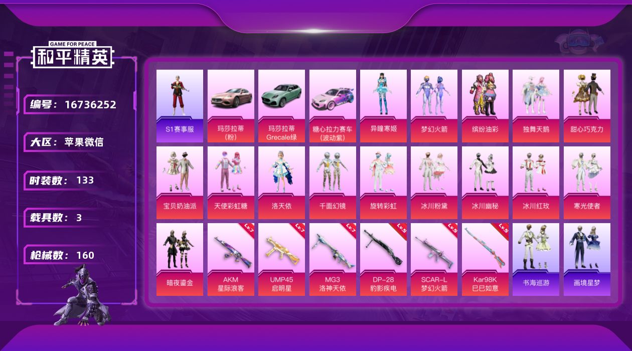 [16736252]【特价出售/店主推荐】苹果 微信-15粉装-6特效枪-3载具-5粉色飞行器-59189热力值-11王牌印记-133套装-160枪皮【热门品类】:粉装-梦幻火箭,粉装-缤纷油彩,套装-S1赛事,套装-浪漫天命,套装-龟仙人,套装-暗影哥特【粉色套装】:粉装-独舞天鹅,粉装-甜心巧克力,粉装-宝贝奶油派,粉装-天使彩虹糖,粉装-梦幻火箭,粉装-缤纷油彩,角色-洛天依,粉装-千面幻镜,粉装-旋转彩虹,粉装-冰川粉黛,粉装-冰川幽秘,粉装-冰川红玫,粉装-寒光使者,粉装-暗夜鎏金,角色-异瞳寒姬【粉色枪皮等级】:AKM-星际浪客(七级),SCAR-L-梦幻火箭(五级),UMP45-启明星(七级),Kar98K-巳巳如意(五级),DP-28-豹影疾电(五级),MG3-洛神天依(七级)【粉色载具】:玛莎拉蒂Ghibli(粉),玛莎拉蒂Grecale(薄荷绿),糖心拉力赛车(波动紫)【粉色枪皮】:AKM-星际浪客,SCAR-L-梦幻火箭,UMP45-启明星,Kar98K-巳巳如意,DP-28-豹影疾电,MG3-洛神天依【粉色飞行器】:梦幻火箭飞行器,千面幻镜飞行器,冰川粉黛飞行器,星际浪客飞行器,天象三御飞行器