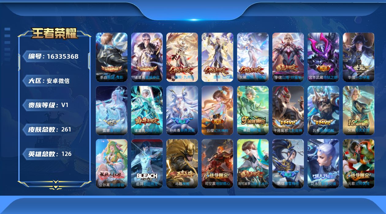 [16335368]【特价出售/店主推荐】安卓WX-V1-最强王者段位-126英雄-261皮肤-2典藏皮肤-14传说-79史诗