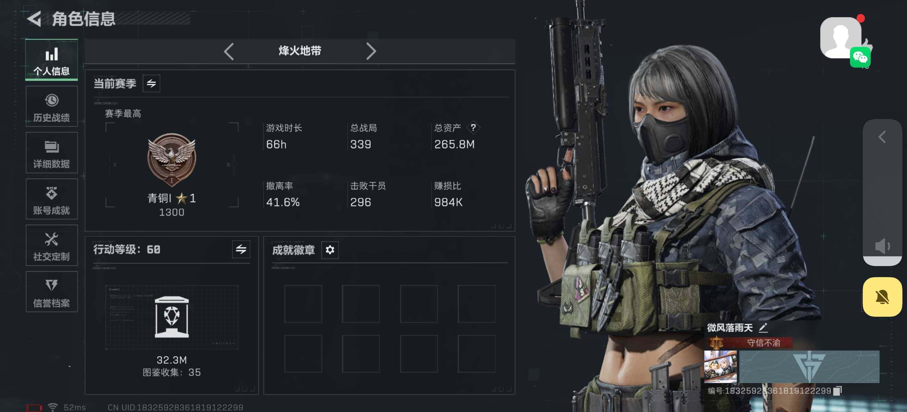 [16336227]【店主推荐捡漏号!可直接换绑】270m总资产-36121k哈伏币-60烽火等级-青铜-1战场等级-无军衔