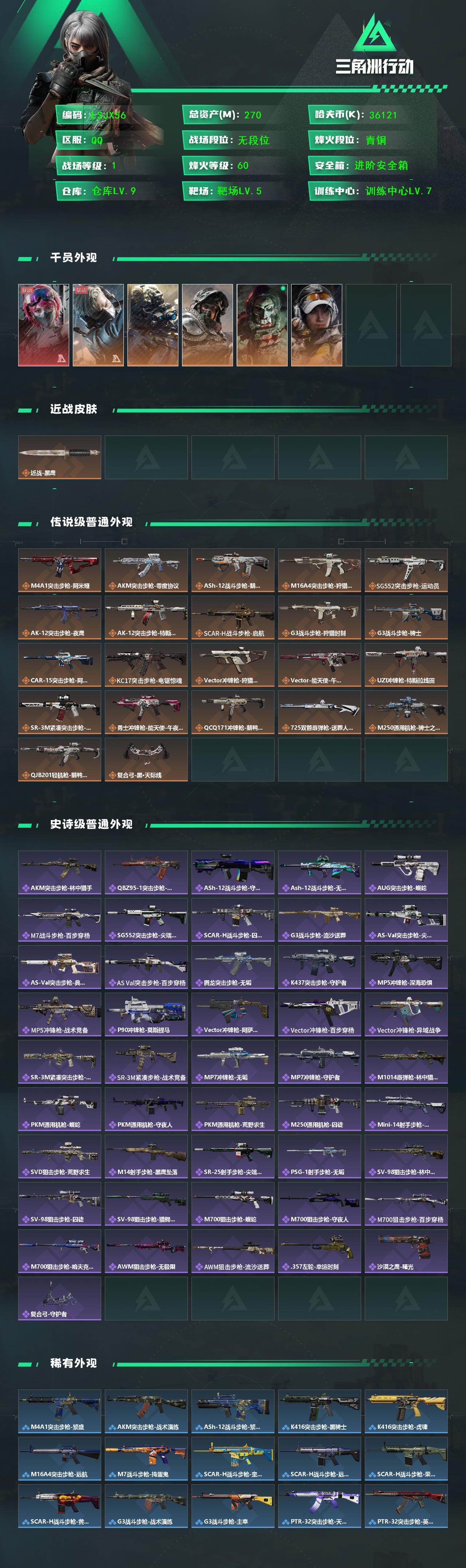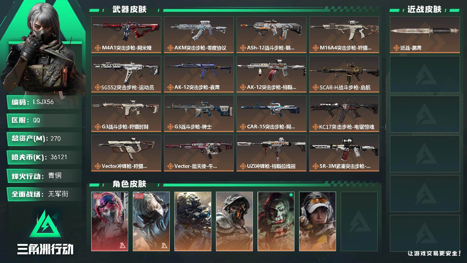 [16336227]【店主推荐捡漏号!可直接换绑】270m总资产-36121k哈伏币-60烽火等级-青铜-1战场等级-无军衔 【干员外观】:蛊-能天使午夜邮差,蜂医-送葬人·无题密令,无名-夜鹰,深蓝-不破誓约,红狼-电锯惊魂,露娜-金牌射手 【近战皮肤】:近战-黑鹰 【传说外观】:M4A1突击步枪-阿米娅,AKM突击步枪-零度协议,ASh-12战斗步枪-鹅鸭杀,M16A4突击步枪-狩猎时刻,SG552突击步枪-运动员,AK-12突击步枪-夜鹰,AK-12突击步枪-特斯拉线圈,SCAR-H战斗步枪-启航,G3战斗步枪-狩猎时刻,G3战斗步枪-骑士,CAR-15突击步枪-阿米娅,KC17突击步枪-电锯惊魂,Vector冲锋枪-狩猎时刻,Vector冲锋枪-能天使-午夜邮差,UZI冲锋枪-特斯拉线圈,SR-3M紧凑突击步枪-特斯拉线圈,勇士冲锋枪-能天使-午夜邮差,QCQ171冲锋枪-鹅鸭杀,725双管霰弹枪-送葬人-无题密令,M250通用机枪-骑士之心,QJB201轻机枪-鹅鸭杀,复合弓-黑·天际线 【史诗外观】:AKM突击步枪-林中猎手,QBZ95-1突击步枪-曙光,ASh-12战斗步枪-守夜人,ASh-12战斗步枪-无极限,AUG突击步枪-蝮蛇,M7战斗步枪-百步穿杨,SG552突击步枪-尖端治疗,SCAR-H战斗步枪-囚徒,G3战斗步枪-流沙送葬,AS Val突击步枪-尖端治疗,AS Val突击步枪-典狱官,AS Val突击步枪-百步穿杨,腾龙突击步枪-无垢,K437突击步枪-守护者,MP5冲锋枪-深海恐惧,MP5冲锋枪-战术竞备,P90冲锋枪-莫斯提马,Vector冲锋枪-阿萨拉文明,Vector冲锋枪-百步穿杨,Vector冲锋枪-异域战争,SR-3M紧凑突击步枪-荒野求生,SR-3M紧凑突击步枪-战术竞备,MP7冲锋枪-无垢,MP7冲锋枪-守护者,M1014霰弹枪-林中猎手,PKM通用机枪-蝮蛇,PKM通用机枪-守夜人,PKM通用机枪-荒野求生,M250通用机枪-囚徒,Mini-14射手步枪-守护者,SVD狙击步枪-荒野求生,M14射手步枪-黑鹰坠落,SR-25射手步枪-尖端治疗,PSG-1射手步枪-无垢,SV-98狙击步枪-林中猎手,SV-98狙击步枪-囚徒,SV-98狙击步枪-猎鳄行动,M700狙击步枪-蝮蛇,M700狙击步枪-守夜人,M700狙击步枪-百步穿杨,M70