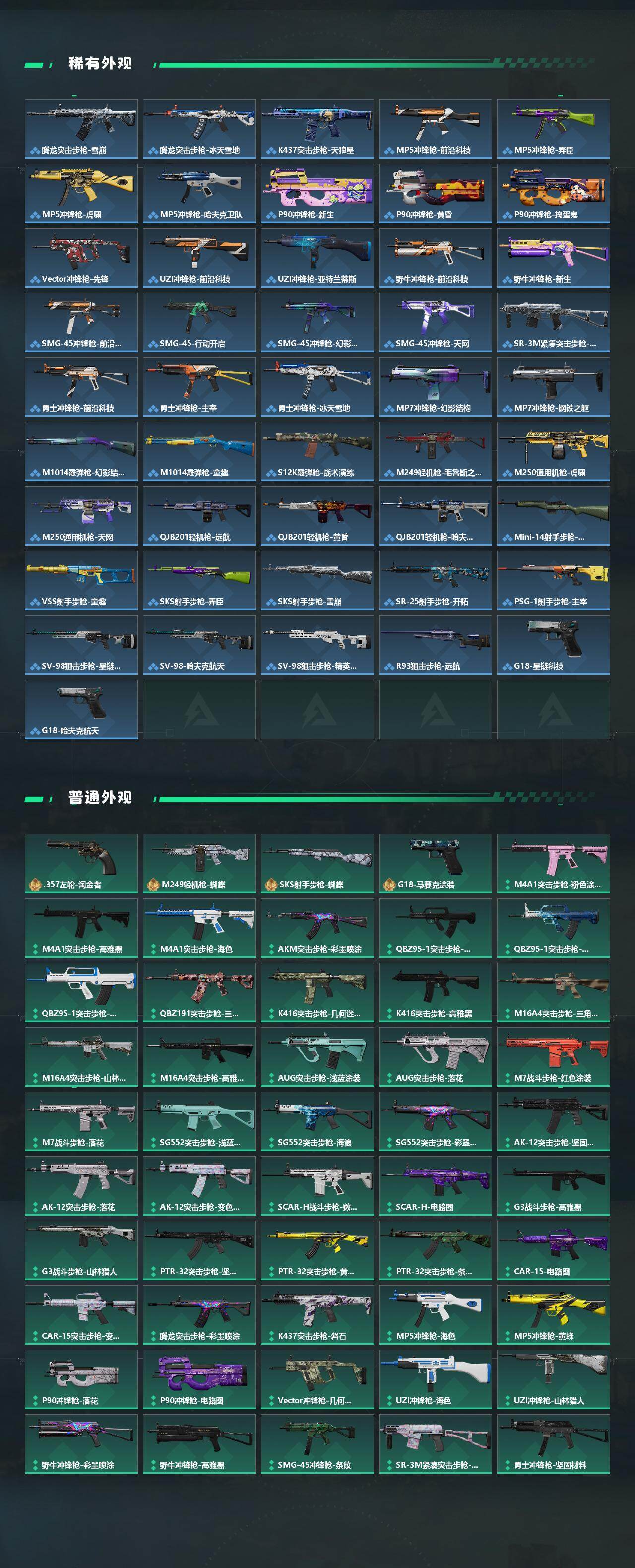 【传说外观】:M4A1突击步枪-阿米娅,AKM突击步枪-零度协议,ASh-12战斗步枪-鹅鸭杀,M16A4突击步枪-狩猎时刻,SG552突击步枪-运动员,AK-12突击步枪-夜鹰,AK-12突击步枪-特斯拉线圈,SCAR-H战斗步枪-启航,G3战斗步枪-狩猎时刻,G3战斗步枪-骑士,CAR-15突击步枪-阿米娅,KC17突击步枪-电锯惊魂,Vector冲锋枪-狩猎时刻,Vector冲锋枪-能天使-午夜邮差,UZI冲锋枪-特斯拉线圈,SR-3M紧凑突击步枪-特斯拉线圈,勇士冲锋枪-能天使-午夜邮差,QCQ171冲锋枪-鹅鸭杀,725双管霰弹枪-送葬人-无题密令,M250通用机枪-骑士之心,QJB201轻机枪-鹅鸭杀,复合弓-黑·天际线