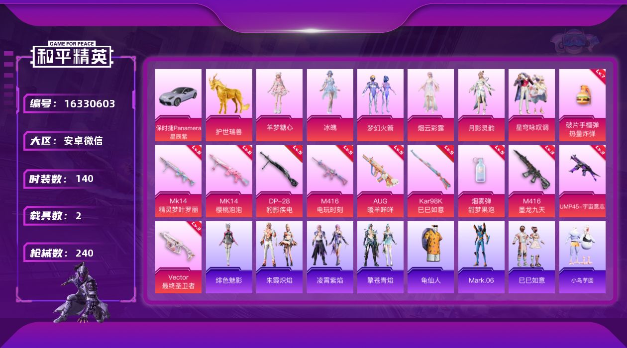 - [17163429]安卓 手Q-无敌战神框-18粉装-14特效枪-0载具-7粉色飞行器-126270热力值-28王牌印记-299套装-386枪皮【热门品类】:粉装-怪诞乔克,粉装-童趣迷兔,套装-浪漫天命,套装-赤蝎幽灵,套装-都市猎人,套装-深海小丑鱼,套装-龟仙人,套装-潮萌小黄鸭,套装-暗影哥特,套装-浪漫波比,角色-8号机,角色-六号稻草人【粉色套装】:粉装-怪诞乔克,粉装-天使彩虹糖,粉装-PEL轰鸣竞梦者,粉装-星空之魅,粉装-幻彩马卡龙,粉装-俏皮狐尾,粉装-冰霜白皇,粉装-童趣迷兔,粉装-炙焰红王,粉装-彩虹鹿灵,角色-洛天依,角色-初号机款机体服,粉装-蓝莓炮弹,粉装-岚岚物语,粉装-橘柚倾心,粉装-飒粉甜心,角色-初号机 觉醒Ver.,粉装-金丰海韵【粉色枪皮等级】:AKM-炫紫旋律(七级),AKM-绿萝繁花(五级),SCAR-L-锦绣绵绵(五级),M416-心之恋语(二级),M416-至情至圣(九级),M416-电玩时刻(五级),GROZA-镜光银凌(五级),AUG-暖羊咩咩(五级),M762-冷魅冰骑(七级),UMP45-量子极限(五级),Kar98K-巳巳如意(五级),DP-28-豹影疾电(五级)【粉色枪皮】:AKM-炫紫旋律,AKM-绿萝繁花,SCAR-L-锦绣绵绵,M416-心之恋语,M416-至情至圣,M416-电玩时刻,GROZA-镜光银凌,AUG-暖羊咩咩,M762-冷魅冰骑,UMP45-量子极限,Kar98K-巳巳如意,Mk14-福马献瑞,DP-28-豹影疾电【粉色飞行器】:炫彩糖果飞行器,祥瑞起舞飞行器,春暖花开飞行器,古堡领主飞行器,庄周梦蝶飞行器,镜域双华-灵镜之阶,幻海精灵飞行器