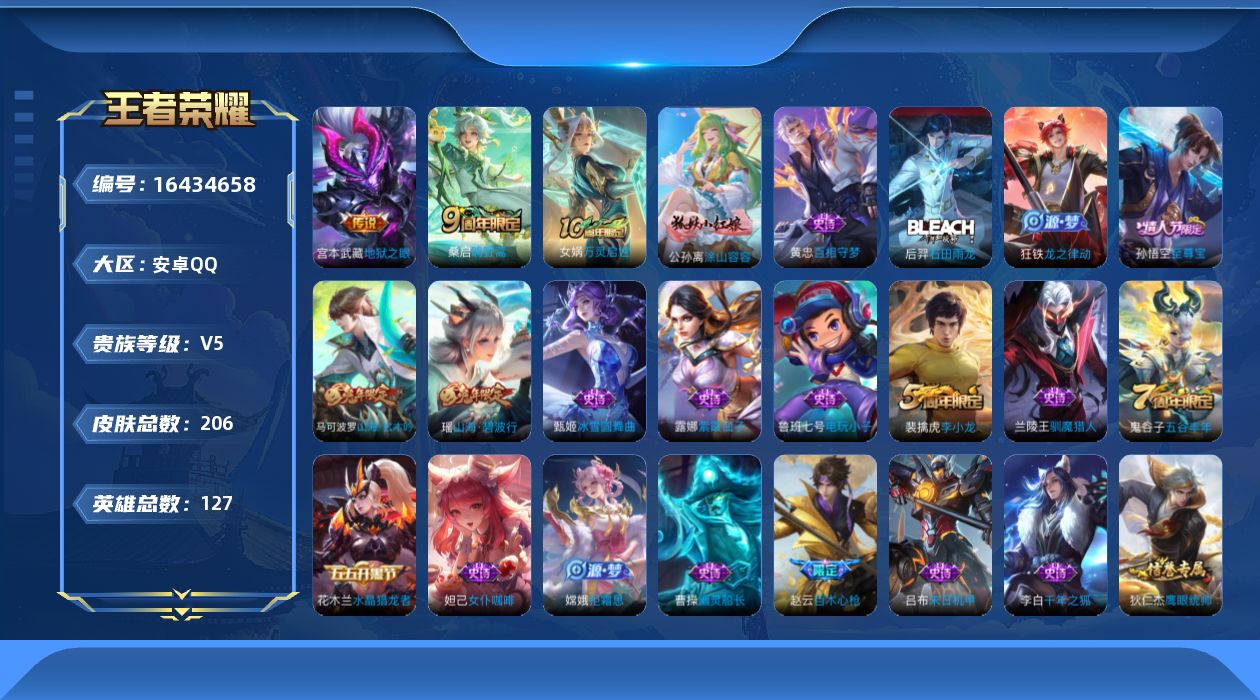 [16434658]【特价出售/店主推荐】安卓Q-V5-至尊星耀V段位-127英雄-206皮肤-3传说-57史诗