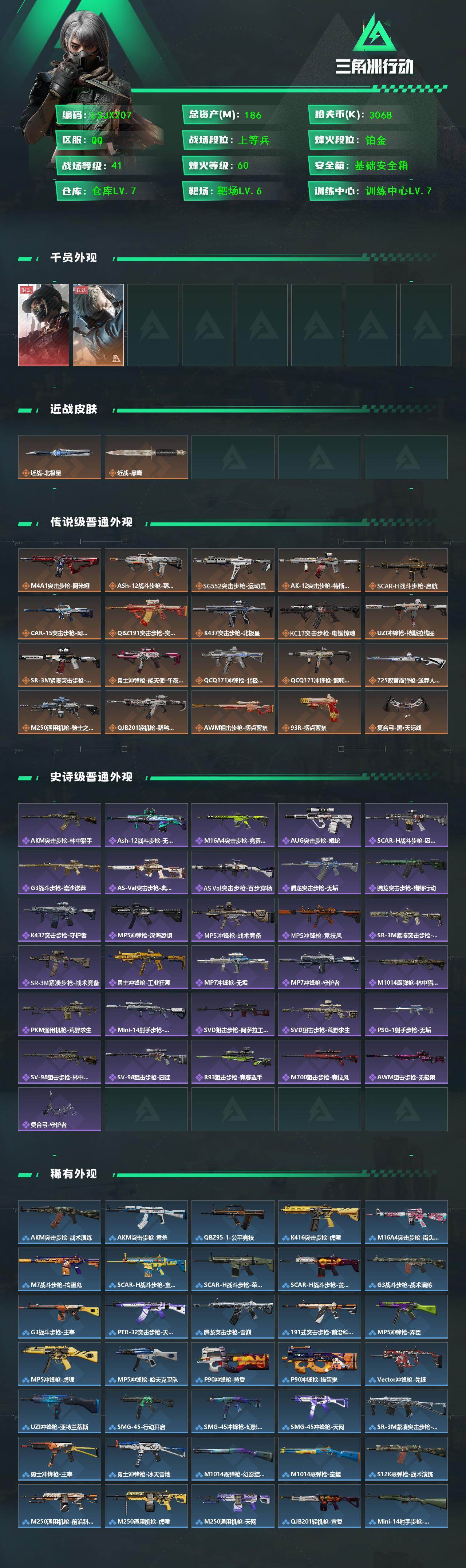 [16754281]【特价出售/店主推荐】186m总资产-3068k哈伏币-60烽火等级-铂金-41战场等级-上等兵 【干员外观】:露娜-黑·天际线,蜂医-送葬人·无题密令 【近战皮肤】:近战-北极星,近战-黑鹰 【传说外观】:M4A1突击步枪-阿米娅,ASh-12战斗步枪-鹅鸭杀,SG552突击步枪-运动员,AK-12突击步枪-特斯拉线圈,SCAR-H战斗步枪-启航,CAR-15突击步枪-阿米娅,腾龙突击步枪-捞点薯条,K437突击步枪-北极星,KC17突击步枪-电锯惊魂,UZI冲锋枪-特斯拉线圈,SR-3M紧凑突击步枪-特斯拉线圈,勇士冲锋枪-能天使-午夜邮差,QCQ171冲锋枪-北极星,QCQ171冲锋枪-鹅鸭杀,725双管霰弹枪-送葬人-无题密令,M250通用机枪-骑士之心,QJB201轻机枪-鹅鸭杀,AWM狙击步枪-捞点薯条,93R-捞点薯条,复合弓-黑·天际线 【史诗外观】:AKM突击步枪-林中猎手,ASh-12战斗步枪-无极限,M16A4突击步枪-竞赛选手,AUG突击步枪-蝮蛇,SCAR-H战斗步枪-囚徒,G3战斗步枪-流沙送葬,AS Val突击步枪-典狱官,AS Val突击步枪-百步穿杨,腾龙突击步枪-无垢,腾龙突击步枪-猎鳄行动,K437突击步枪-守护者,MP5冲锋枪-深海恐惧,MP5冲锋枪-战术竞备,MP5冲锋枪-竞技风,SR-3M紧凑突击步枪-荒野求生,SR-3M紧凑突击步枪-战术竞备,勇士冲锋枪-工业狂潮,MP7冲锋枪-无垢,MP7冲锋枪-守护者,M1014霰弹枪-林中猎手,PKM通用机枪-荒野求生,Mini-14射手步枪-守护者,SVD狙击步枪-阿萨拉工艺,SVD狙击步枪-荒野求生,PSG-1射手步枪-无垢,SV-98狙击步枪-林中猎手,SV-98狙击步枪-囚徒,R93狙击步枪-竞赛选手,M700狙击步枪-竞技风,AWM狙击步枪-无极限,复合弓-守护者 【稀有外观】:AKM突击步枪-战术演练,AKM突击步枪-肃杀,QBZ95-1突击步枪-公平竞技,K416突击步枪-虎啸,M16A4突击步枪-街头涂鸦,M7战斗步枪-捣蛋鬼,SCAR-H战斗步枪-童趣,SCAR-H战斗步枪-荣耀列队,SCAR-H战斗步枪-黄昏,G3战斗步枪-战术演练,G3战斗步枪-主宰*2,PTR-32突击步枪-天网,腾龙突击步枪-雪崩,腾龙突击步枪-前沿科技,MP5冲锋枪-弄臣,MP5冲锋枪