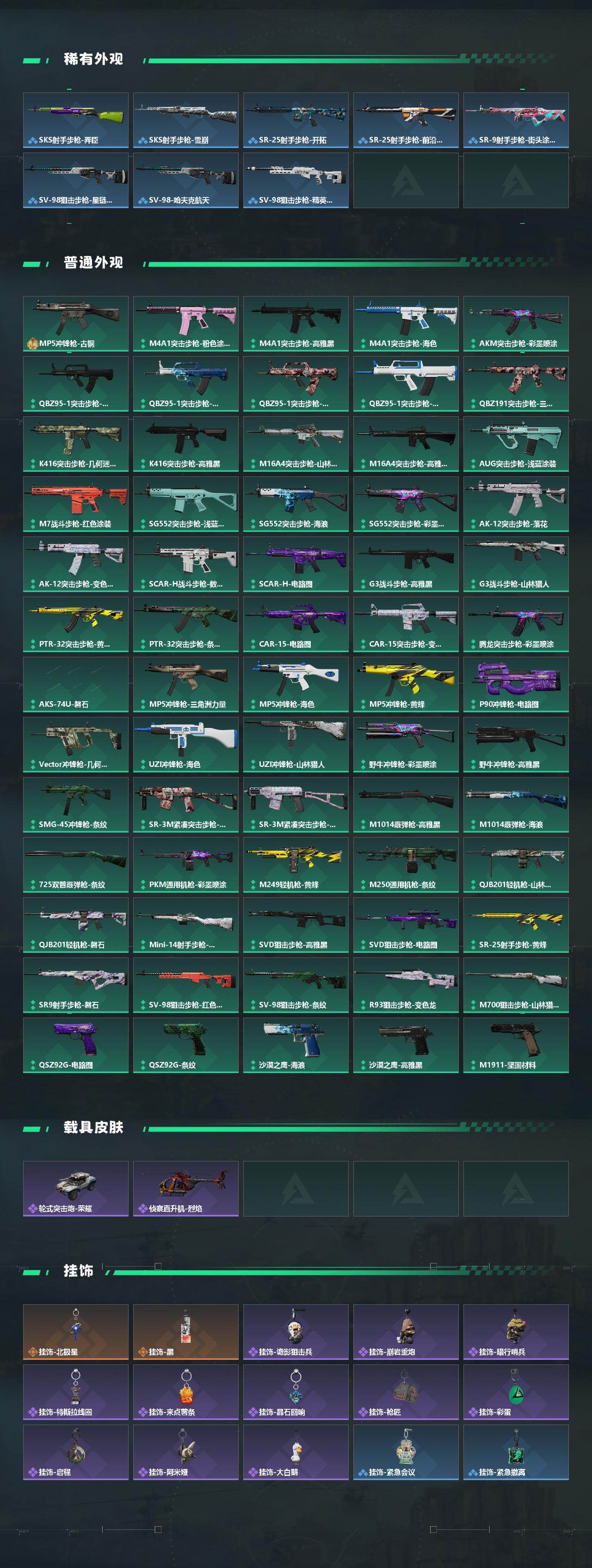 【稀有外观】:AKM突击步枪-战术演练,AKM突击步枪-肃杀,QBZ95-1突击步枪-公平竞技,K416突击步枪-虎啸,M16A4突击步枪-街头涂鸦,M7战斗步枪-捣蛋鬼,SCAR-H战斗步枪-童趣,SCAR-H战斗步枪-荣耀列队,SCAR-H战斗步枪-黄昏,G3战斗步枪-战术演练,G3战斗步枪-主宰*2,PTR-32突击步枪-天网,腾龙突击步枪-雪崩,腾龙突击步枪-前沿科技,MP5冲锋枪-弄臣,MP5冲锋枪