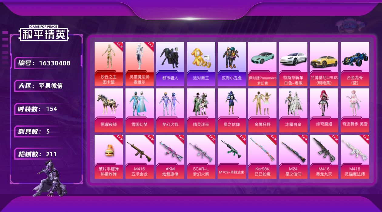 [16330408]【特价出售/店主推荐】苹果 微信-无敌战神框-2神装-8粉装-11特效枪-5载具-7粉色飞行器-83216热力值-14王牌印记-154套装-211枪皮