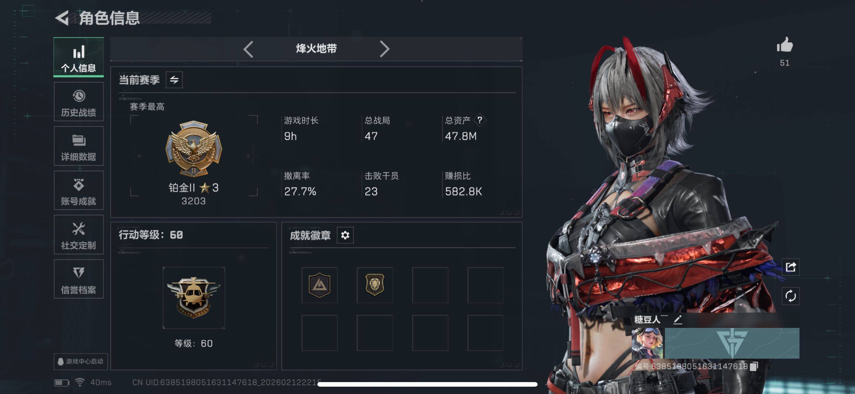 [16754393]47m总资产-1k哈伏币-60烽火等级-铂金-12战场等级-列兵