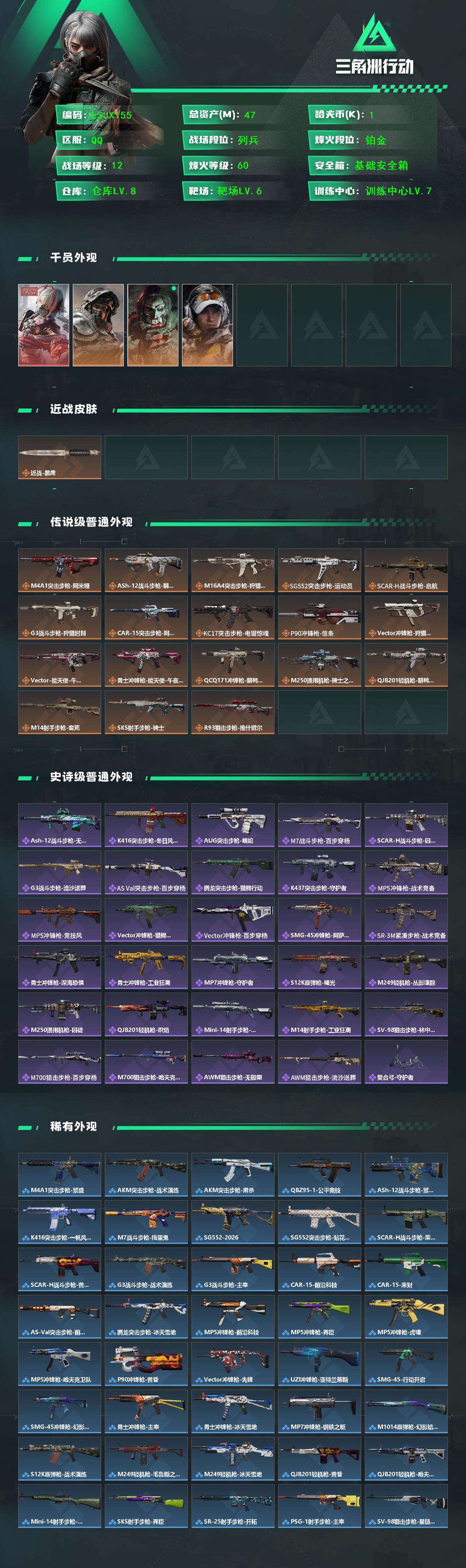 [16754393]47m总资产-1k哈伏币-60烽火等级-铂金-12战场等级-列兵 【干员外观】:骇爪-维什戴尔,深蓝-不破誓约,红狼-电锯惊魂,露娜-金牌射手 【近战皮肤】:近战-黑鹰 【传说外观】:M4A1突击步枪-阿米娅,ASh-12战斗步枪-鹅鸭杀,M16A4突击步枪-狩猎时刻,SG552突击步枪-运动员,SCAR-H战斗步枪-启航,G3战斗步枪-狩猎时刻,CAR-15突击步枪-阿米娅,KC17突击步枪-电锯惊魂,P90冲锋枪-信条,Vector冲锋枪-狩猎时刻,Vector冲锋枪-能天使-午夜邮差,勇士冲锋枪-能天使-午夜邮差,QCQ171冲锋枪-鹅鸭杀,M250通用机枪-骑士之心,QJB201轻机枪-鹅鸭杀,M14射手步枪-蛮荒,SKS射手步枪-骑士,R93狙击步枪-维什戴尔 【史诗外观】:ASh-12战斗步枪-无极限,K416突击步枪-冬日风情,AUG突击步枪-蝮蛇,M7战斗步枪-百步穿杨,SCAR-H战斗步枪-囚徒,G3战斗步枪-流沙送葬,AS Val突击步枪-百步穿杨,腾龙突击步枪-猎鳄行动,K437突击步枪-守护者,MP5冲锋枪-战术竞备,MP5冲锋枪-竞技风,Vector冲锋枪-猎鳄行动,Vector冲锋枪-百步穿杨,SMG-45冲锋枪-阿萨拉特攻,SR-3M紧凑突击步枪-战术竞备,勇士冲锋枪-深海恐惧,勇士冲锋枪-工业狂潮,MP7冲锋枪-守护者,S12K霰弹枪-曙光,M249轻机枪-丛影谍踪,M250通用机枪-囚徒,QJB201轻机枪-炽焰,Mini-14射手步枪-守护者,M14射手步枪-工业狂潮,SV-98狙击步枪-林中猎手,M700狙击步枪-百步穿杨,M700狙击步枪-哈夫克警备,AWM狙击步枪-无极限,AWM狙击步枪-流沙送葬,复合弓-守护者 【稀有外观】:M4A1突击步枪-繁盛,AKM突击步枪-战术演练,AKM突击步枪-肃杀,QBZ95-1突击步枪-公平竞技,ASh-12战斗步枪-繁盛,K416突击步枪-一帆风顺,M7战斗步枪-捣蛋鬼,SG552突击步枪-2026,SG552突击步枪-贴花艺术,SCAR-H战斗步枪-荣耀列队,SCAR-H战斗步枪-黄昏,G3战斗步枪-战术演练,G3战斗步枪-主宰*2,CAR-15突击步枪-前沿科技,CAR-15突击步枪-来财,AS Val突击步枪-前沿科技,腾龙突击步枪-冰天雪地,MP5冲锋枪-前沿科技,MP5冲锋枪