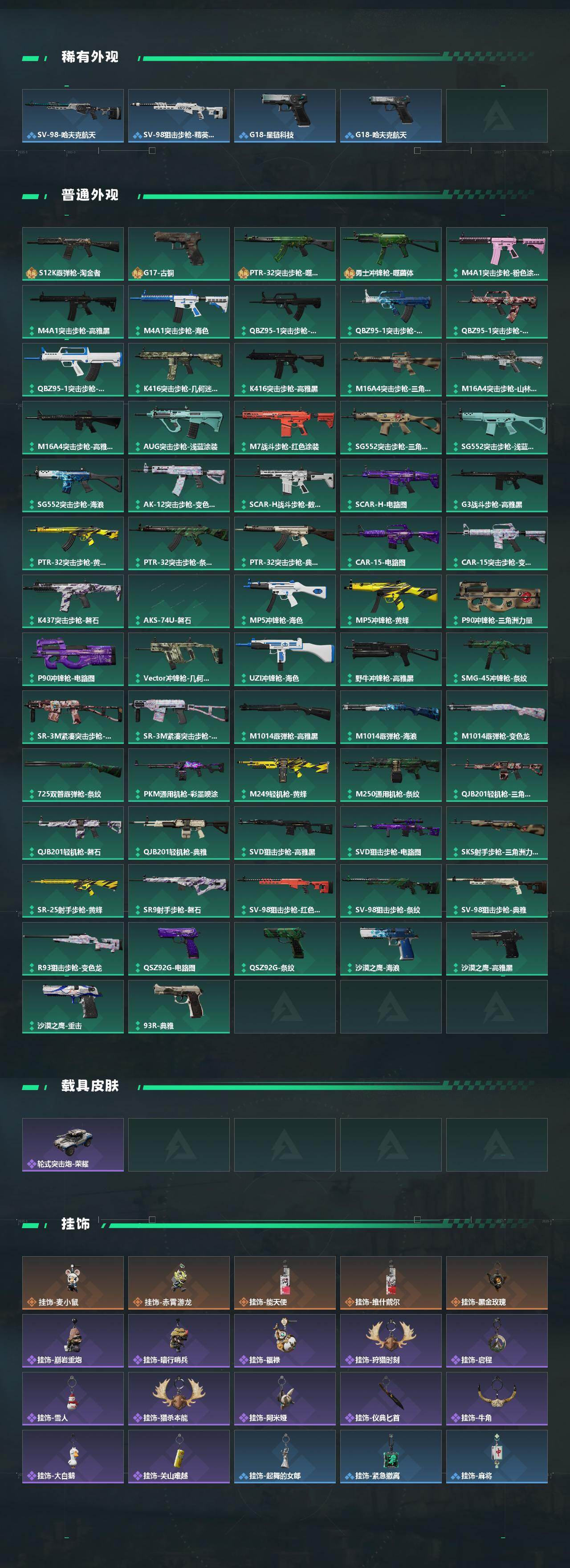 【稀有外观】:M4A1突击步枪-繁盛,AKM突击步枪-战术演练,AKM突击步枪-肃杀,QBZ95-1突击步枪-公平竞技,ASh-12战斗步枪-繁盛,K416突击步枪-一帆风顺,M7战斗步枪-捣蛋鬼,SG552突击步枪-2026,SG552突击步枪-贴花艺术,SCAR-H战斗步枪-荣耀列队,SCAR-H战斗步枪-黄昏,G3战斗步枪-战术演练,G3战斗步枪-主宰*2,CAR-15突击步枪-前沿科技,CAR-15突击步枪-来财,AS Val突击步枪-前沿科技,腾龙突击步枪-冰天雪地,MP5冲锋枪-前沿科技,MP5冲锋枪