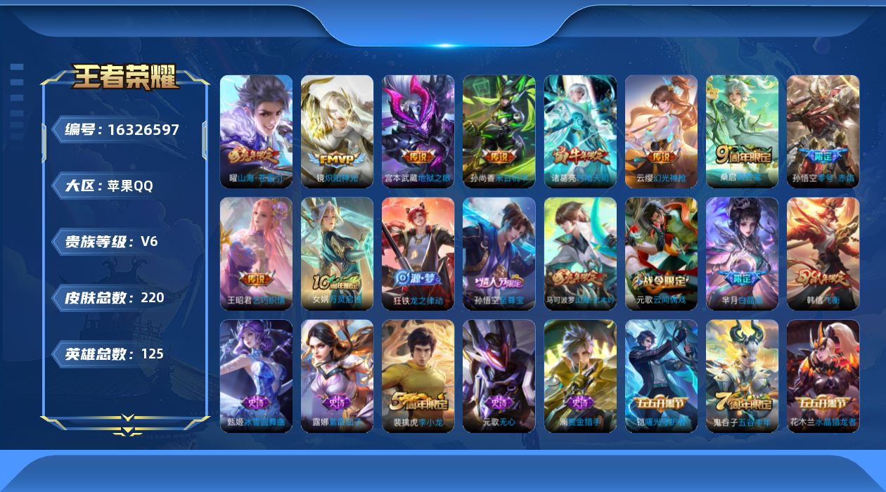 [16326597]小国标韩信。小国标芈月【特价出售/店主推荐】苹果Q-V6-最强王者段位-125英雄-220皮肤-10传说-49史诗