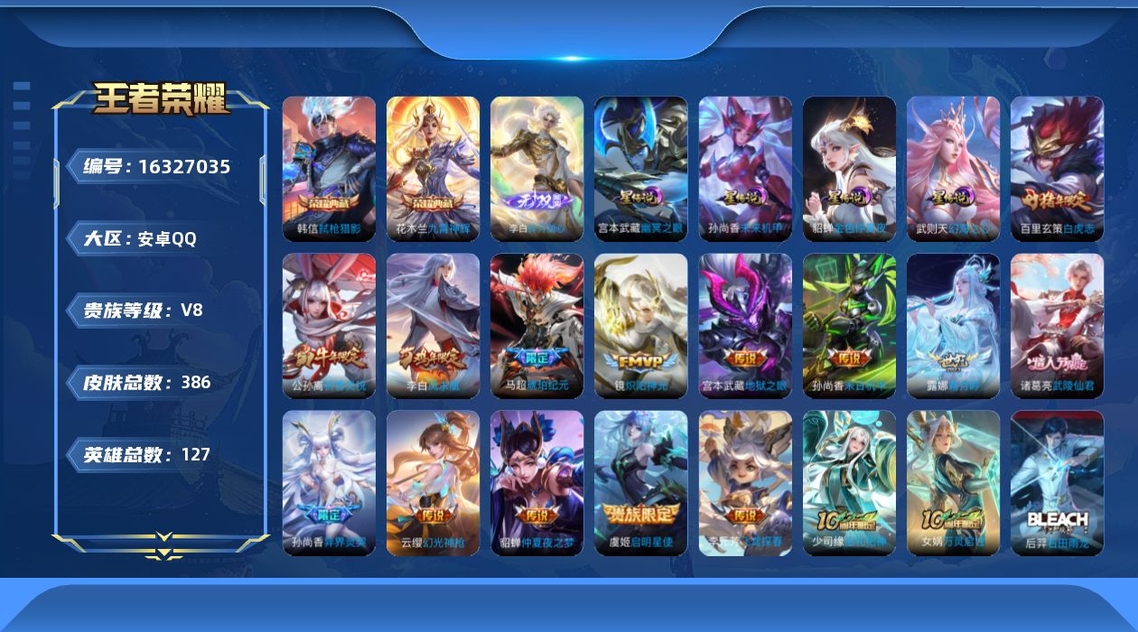 [16327035]【特价出售/店主推荐】安卓Q-V8-最强王者段位-127英雄-386皮肤-2典藏皮肤-1无双-15传说-116史诗-4星元