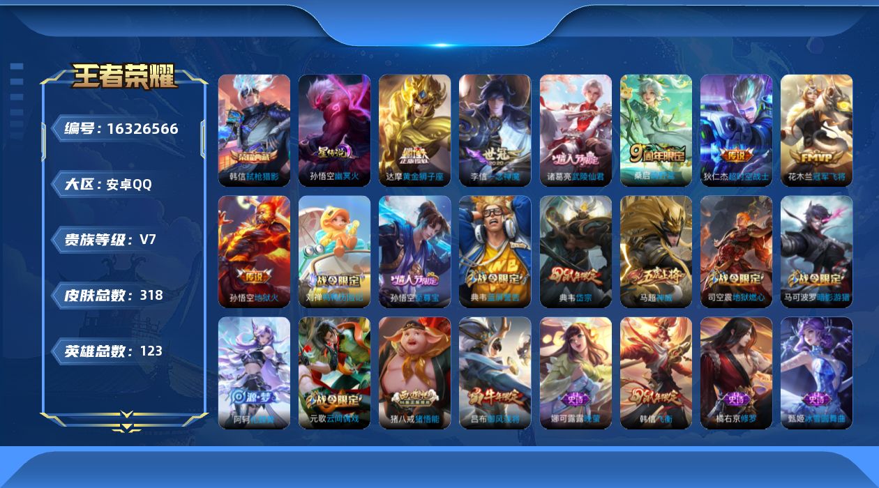 [16326566]安卓Q-V7-最强王者段位-123英雄-318皮肤-1典藏皮肤-7传说-93史诗
