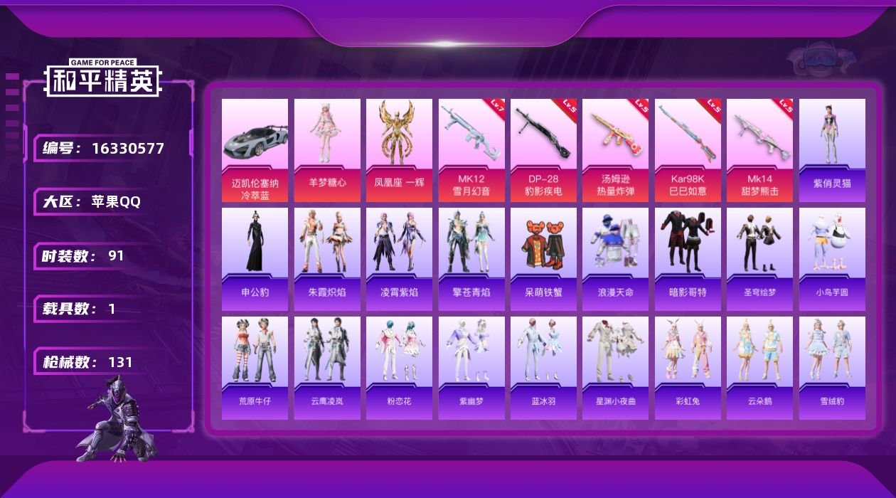[16330577]【特价出售/店主推荐】 地铁满天赋 苹果 手Q-2粉装-5特效枪-1载具-3粉色飞行器-36725热力值-5王牌印记-91套装-131枪皮【热门品类】:套装-浪漫天命,套装-暗影哥特【粉色套装】:角色-凤凰座 一辉,角色-羊梦糖心【粉色枪皮等级】:汤姆逊-热量炸弹(五级),Kar98K-巳巳如意(五级),Mk14-甜梦熊击(五级),MK12-雪月幻音(七级),DP-28-豹影疾电(五级)【粉色载具】:迈凯伦塞纳(冷萃蓝)【粉色枪皮】:汤姆逊-热量炸弹,Kar98K-巳巳如意,Mk14-甜梦熊击,MK12-雪月幻音,DP-28-豹影疾电【粉色飞行器】:幻星舰长飞行器,灵猫魔法师飞行器