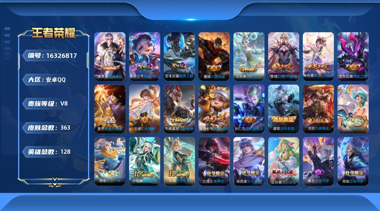 [16326817]【特价出售/店主推荐】,安卓Q-V8-至尊星耀III段位-128英雄-362皮肤-1典藏皮肤-13传说-102史诗
