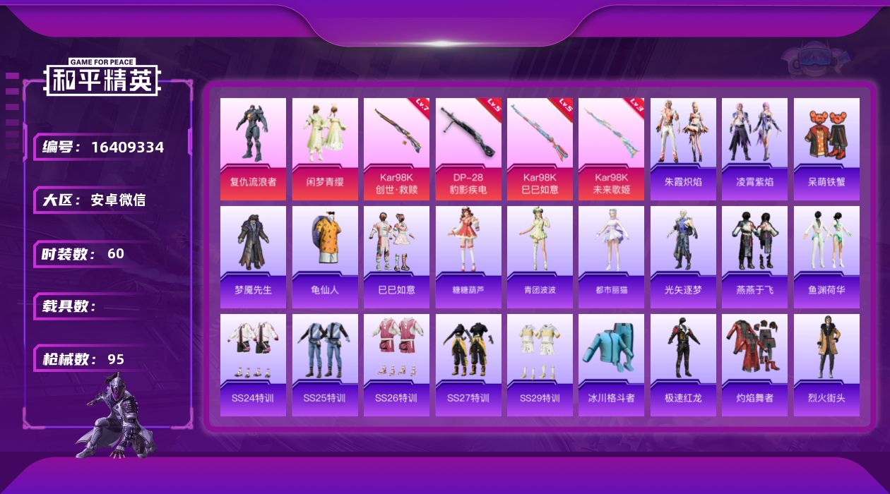 [16409334]【特价出售/店主推荐】安卓 微信-2粉装-4特效枪-0载具-0粉色飞行器-27426热力值-5王牌印记-60套装-95枪皮 【热门品类】:套装-龟仙人 【粉色套装】:角色-复仇流浪者,粉装-闲梦青缨 【粉色枪皮等级】:Kar98K-未来歌姬(三级),Kar98K-创世·救赎(七级),Kar98K-巳巳如意(五级),DP-28-豹影疾电(五级) 【粉色枪皮】:Kar98K-未来歌姬,Kar98K-创世·救赎,Kar98K-巳巳如意,DP-28-豹影疾电 【粉色降落伞】:未来歌姬降落伞,莲影清波降落伞,忍者神龟降落伞,月影灵韵降落伞,鬼刀降落伞,魔童闹海 哪吒降落伞 【稀有套装】:套装-龟仙人,套装-巳巳如意,套装-糖糖葫芦,套装-青团波波,角色-都市丽猫,角色-光矢逐梦,套装-燕燕于飞,套装-鱼渊荷华,套装-朱霞炽焰,套装-凌霄紫焰 【稀有枪皮】:AKM-破晓战魂,AKM-虎虎生威,AKM-龙的传人,SCAR-L-炫彩节奏,SCAR-L-玉兔迎春,SCAR-L-红色方程式,M416-糯团青竹,M416-绯红前夜,GROZA-懵萌河马,AUG-黑白懵懵牛,M762-天星战神,AC-VAL-天降萌叽,ARX-凌霄紫焰,UZI-天降萌叽,UZI-影袭,UMP45-生命誓言,Vector-生命誓言,Vector-创世·救赎,汤姆逊-天降萌叽,JS9-凌霄紫焰,P90-巳巳如意,Kar98K-彩虹符号,Kar98K-影袭,Kar98K-洛神天依,M24-影袭,SKS-迅猛狂鲨,VSS-彩虹符号,Mini14-穿刺龙虾,M417-惊鸿侠骨,M200-惊鸿侠骨,S686-奇异狩猎者,S686-彩虹符号,S686-生命誓言,S686-巳巳如意,S12K-玩趣呆呆,DBS-月影灵韵,M249-彩虹符号,DP-28-彩虹符号,MG3-幻世战舞者,MG3-惊鸿侠骨,MG-36-凌霄紫焰,P92-凌霄紫焰,R45-幻彩电音,爆炸猎弓-惊鸿侠骨,大砍刀-鬼刀,平底锅-凌霄紫焰,破片手榴弹-巳巳如意 【其他套装】:套装-SS24特训,套装-SS25特训,套装-SS26特训,套装-SS27特训,套装-SS29特训,套装-冰川格斗者,套装-极速红龙,套装-灼焰舞者,套装-烈火街头,套装-猎鹰,套装-猛禽,套装-破蛋小黄鸡,套装-空岛之星,套装-竞技名士,套装-绯格组合,套装-缤纷果语,套装-长空猛