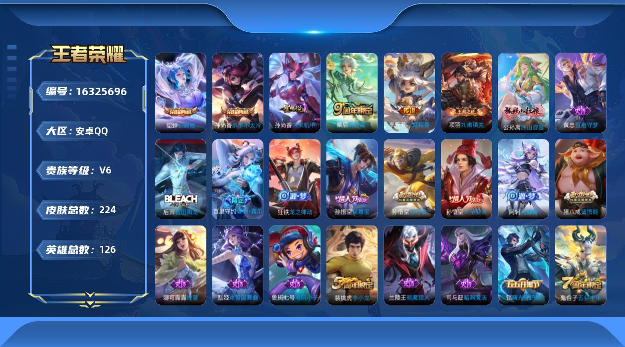 [16325696]【特价出售/店主推荐】安卓Q-V6-最强王者段位-126英雄-223皮肤-2典藏皮肤-3传说-59史诗-1星元