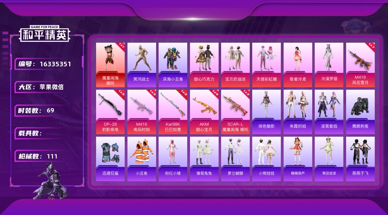 [16335351]【特价出售/店主推荐】苹果 微信-无敌战神框-1神装-5粉装-6特效枪-0载具-4粉色飞行器-36603热力值-11王牌印记-69套装-111枪皮 【红色神装等级】:魔童闹海-哪吒(一级) 【红色角色神装】:魔童闹海-哪吒 【热门品类】:套装-冥河战士,套装-深海小丑鱼,套装-小丑鱼,套装-粉红小猪 【粉色套装】:粉装-甜心巧克力,粉装-宝贝奶油派,粉装-天使彩虹糖,角色-歌者泠鸢,角色-冷漠罗丽 【粉色枪皮等级】:AKM-甜心宝贝(四级),SCAR-L-魔童闹海 哪吒(三级),M416-风花雪月(七级),M416-电玩时刻(五级),Kar98K-巳巳如意(五级),DP-28-豹影疾电(五级) 【粉色枪皮】:AKM-甜心宝贝,SCAR-L-魔童闹海 哪吒,M416-风花雪月,M416-电玩时刻,Kar98K-巳巳如意,DP-28-豹影疾电 【粉色飞行器】:梦幻火箭飞行器,齐天大圣飞行器,飞天猪飞行器 【粉色降落伞】:甜心宝贝降落伞,天之羽翼降落伞,闲梦青缨降落伞,创世·救赎降落伞,智耀战神降落伞,魔童闹海 哪吒降落伞,炫彩糖果降落伞 【稀有套装】:套装-雏菊兔兔,套装-萝兰蝴蝶,套装-小熊娃娃,套装-糖糖葫芦,套装-青团波波,套装-燕燕于飞,套装-鱼渊荷华,角色-蜜桃派对,套装-紫幽梦,套装-蓝冰羽,套装-云朵鹅,套装-雪绒豹,角色-时希公主,套装-朱霞炽焰,套装-凌霄紫焰,角色-绯色魅影 【稀有枪皮】:AKM-缤纷海域,AKM-玄冥寒域,M16A4-冥河战士,SCAR-L-黄金龙骨,M416-糯团青竹,M416-红色方程式,AUG-天降萌叽,AUG-甜蜜菠萝,AUG-耀粉歌者,QBZ-彩虹符号,M762-甜心宝贝,M762-云朵鹅,蜜獾-千面幻镜,ARX-凌霄紫焰,UZI-影袭,Vector-创世·救赎,汤姆逊-天降萌叽,JS9-凌霄紫焰,Kar98K-彩虹符号,Kar98K-红色方程式,M24-影袭,M24-樱桃泡泡,SKS-炫彩节奏,SKS-迅猛狂鲨,Mini14-穿刺龙虾,M417-惊鸿侠骨,M200-惊鸿侠骨,SVD-云朵鹅,SVD-冷漠罗丽,S12K-玩趣呆呆,S12K-智耀战神,SPAS-12-云朵鹅,M249-彩虹符号,DP-28-甜心宝贝,DP-28-齐天大圣,MG3-惊鸿侠骨,MG-36-凌霄紫焰,P92-凌霄紫焰,沙漠之鹰-云朵鹅,爆炸猎弓-