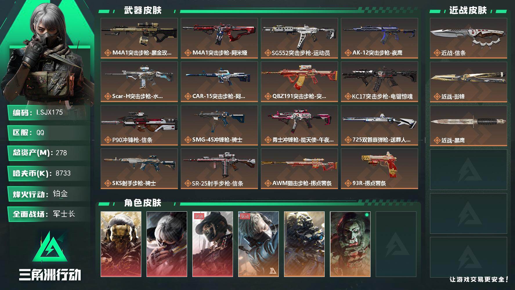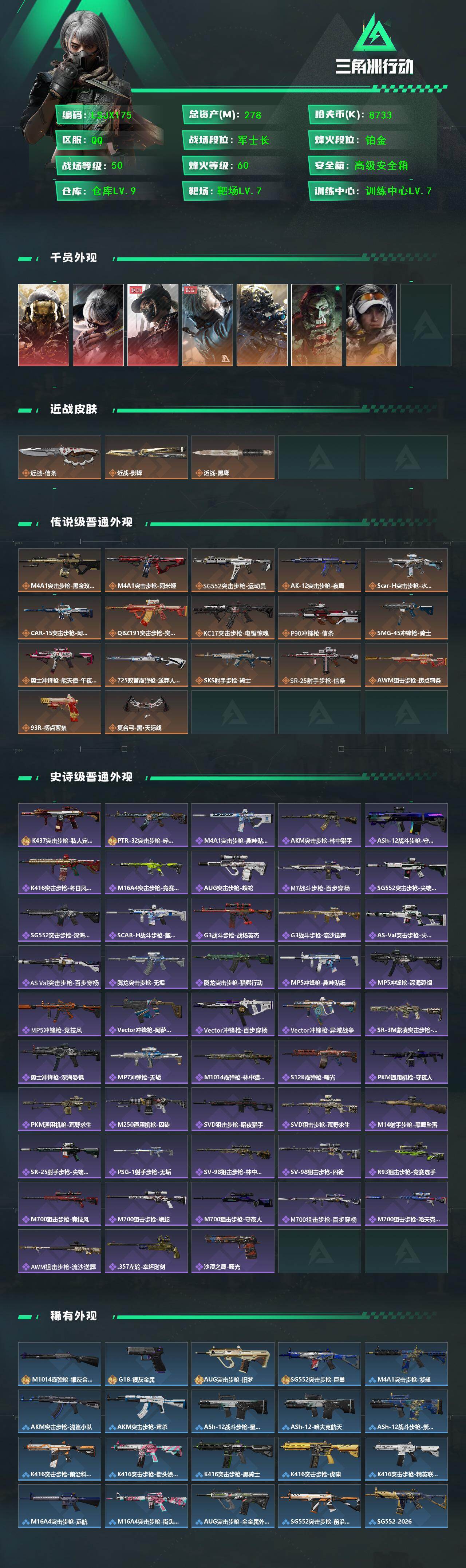 [16580158]【特价出售/店主推荐】278m总资产-8733k哈伏币-60烽火等级-铂金-50战场等级-军士长 【干员外观】:红狼-蚀金玫瑰,骇爪-水墨云图,露娜-黑·天际线,蜂医-送葬人·无题密令,无名-夜鹰,红狼-电锯惊魂,露娜-金牌射手 【近战皮肤】:近战-信条,近战-影锋,近战-黑鹰 【传说外观】:M4A1突击步枪-蚀金玫瑰,M4A1突击步枪-阿米娅,SG552突击步枪-运动员,AK-12突击步枪-夜鹰,SCAR-H战斗步枪-水墨云图,CAR-15突击步枪-阿米娅,腾龙突击步枪-捞点薯条,KC17突击步枪-电锯惊魂,P90冲锋枪-信条,SMG-45冲锋枪-骑士,勇士冲锋枪-能天使-午夜邮差,725双管霰弹枪-送葬人-无题密令,SKS射手步枪-骑士,SR-25射手步枪-信条,AWM狙击步枪-捞点薯条,93R-捞点薯条,复合弓-黑·天际线 【史诗外观】:K437突击步枪-私人定制,PTR-32突击步枪-碎冰行动,M4A1突击步枪-趣味贴纸,AKM突击步枪-林中猎手,ASh-12战斗步枪-守夜人,K416突击步枪-冬日风情,M16A4突击步枪-竞赛选手,AUG突击步枪-蝮蛇,M7战斗步枪-百步穿杨,SG552突击步枪-尖端治疗,SG552突击步枪-深海恐惧,SCAR-H战斗步枪-趣味贴纸,G3战斗步枪-战场英杰,G3战斗步枪-流沙送葬,AS Val突击步枪-尖端治疗,AS Val突击步枪-百步穿杨,腾龙突击步枪-无垢,腾龙突击步枪-猎鳄行动,MP5冲锋枪-趣味贴纸,MP5冲锋枪-深海恐惧,MP5冲锋枪-竞技风,Vector冲锋枪-阿萨拉文明,Vector冲锋枪-百步穿杨,Vector冲锋枪-异域战争,SR-3M紧凑突击步枪-荒野求生,勇士冲锋枪-深海恐惧,MP7冲锋枪-无垢,M1014霰弹枪-林中猎手,S12K霰弹枪-曙光,PKM通用机枪-守夜人,PKM通用机枪-荒野求生,M250通用机枪-囚徒,SVD狙击步枪-暗夜猎手,SVD狙击步枪-荒野求生,M14射手步枪-黑鹰坠落,SR-25射手步枪-尖端治疗,PSG-1射手步枪-无垢,SV-98狙击步枪-林中猎手,SV-98狙击步枪-囚徒,R93狙击步枪-竞赛选手,M700狙击步枪-竞技风,M700狙击步枪-蝮蛇,M700狙击步枪-守夜人,M700狙击步枪-百步穿杨,M700狙击步枪-哈夫克警备,AWM狙击步枪-流沙送葬,.357左