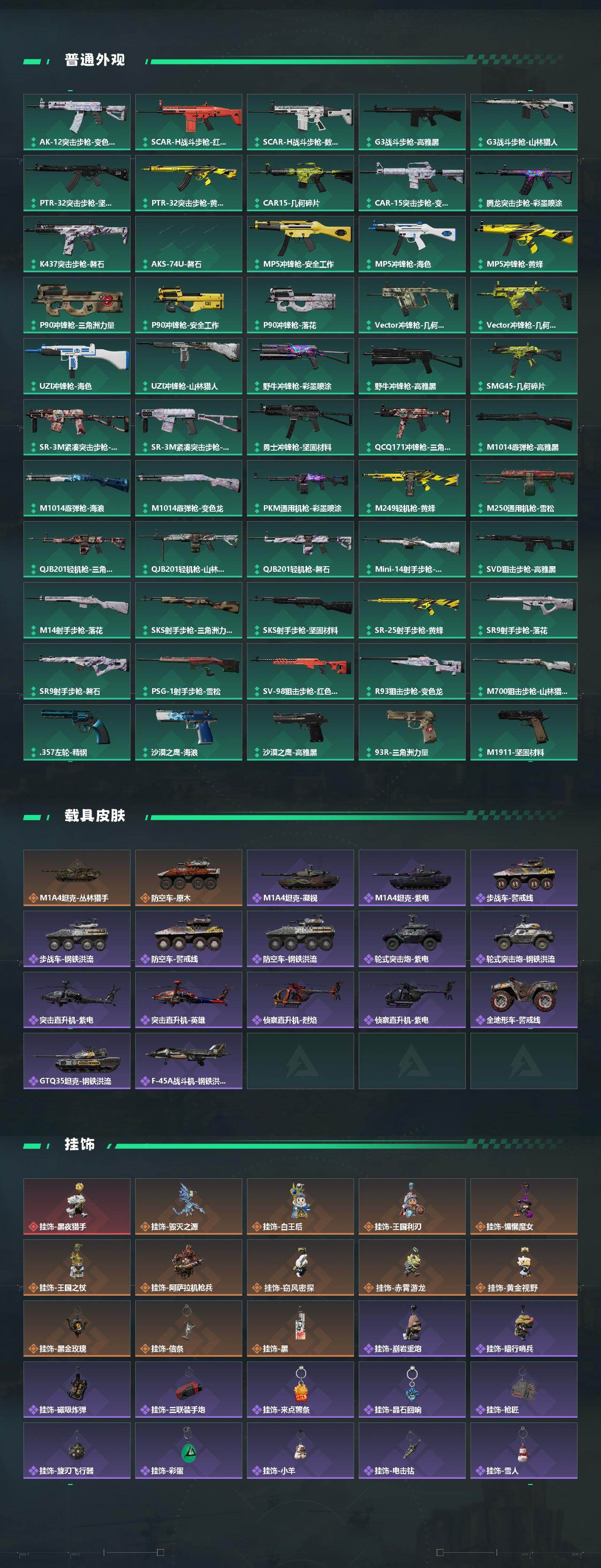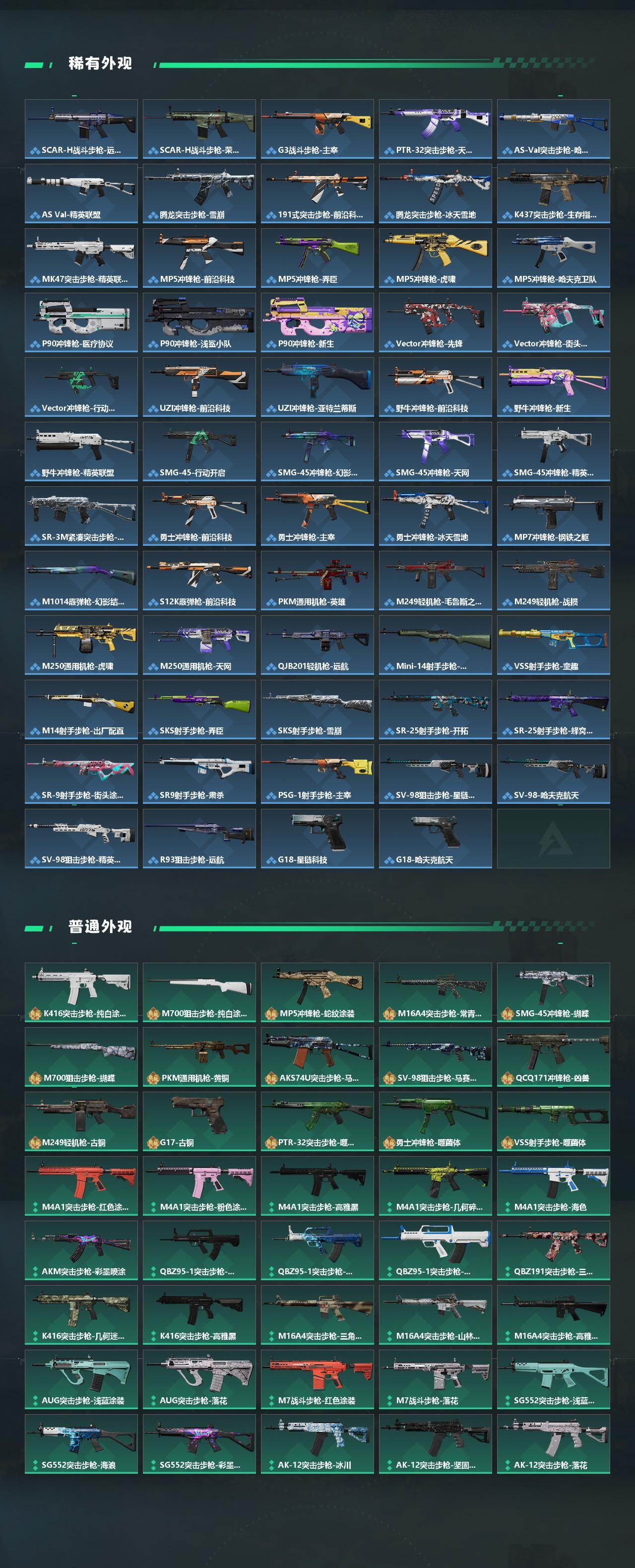【史诗外观】:K437突击步枪-私人定制,PTR-32突击步枪-碎冰行动,M4A1突击步枪-趣味贴纸,AKM突击步枪-林中猎手,ASh-12战斗步枪-守夜人,K416突击步枪-冬日风情,M16A4突击步枪-竞赛选手,AUG突击步枪-蝮蛇,M7战斗步枪-百步穿杨,SG552突击步枪-尖端治疗,SG552突击步枪-深海恐惧,SCAR-H战斗步枪-趣味贴纸,G3战斗步枪-战场英杰,G3战斗步枪-流沙送葬,AS Val突击步枪-尖端治疗,AS Val突击步枪-百步穿杨,腾龙突击步枪-无垢,腾龙突击步枪-猎鳄行动,MP5冲锋枪-趣味贴纸,MP5冲锋枪-深海恐惧,MP5冲锋枪-竞技风,Vector冲锋枪-阿萨拉文明,Vector冲锋枪-百步穿杨,Vector冲锋枪-异域战争,SR-3M紧凑突击步枪-荒野求生,勇士冲锋枪-深海恐惧,MP7冲锋枪-无垢,M1014霰弹枪-林中猎手,S12K霰弹枪-曙光,PKM通用机枪-守夜人,PKM通用机枪-荒野求生,M250通用机枪-囚徒,SVD狙击步枪-暗夜猎手,SVD狙击步枪-荒野求生,M14射手步枪-黑鹰坠落,SR-25射手步枪-尖端治疗,PSG-1射手步枪-无垢,SV-98狙击步枪-林中猎手,SV-98狙击步枪-囚徒,R93狙击步枪-竞赛选手,M700狙击步枪-竞技风,M700狙击步枪-蝮蛇,M700狙击步枪-守夜人,M700狙击步枪-百步穿杨,M700狙击步枪-哈夫克警备,AWM狙击步枪-流沙送葬,.357左
