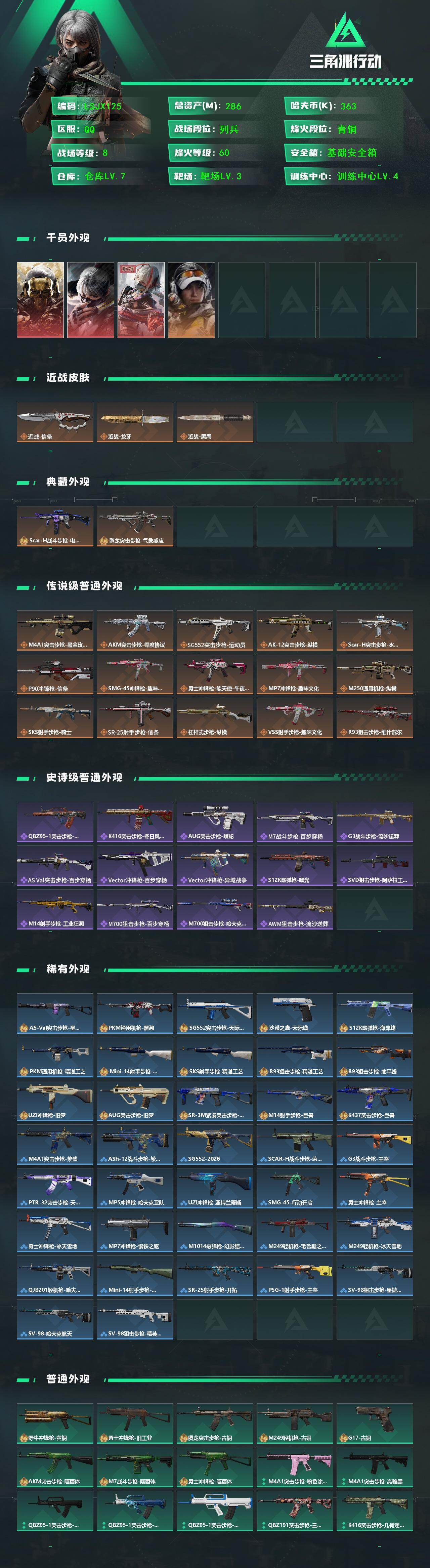[16363692]2典藏砖皮【特价出售/店主推荐】286m总资产-363k哈伏币-60烽火等级-青铜-8战场等级-列兵 【干员外观】:红狼-蚀金玫瑰,骇爪-水墨云图,骇爪-维什戴尔,露娜-金牌射手 【近战皮肤】:近战-信条,近战-龙牙,近战-黑鹰 【典藏外观】:SCAR-H战斗步枪-电玩高手,腾龙突击步枪-气象感应 【典藏外观成色】:SCAR-H战斗步枪-电玩高手(优品A),腾龙突击步枪-气象感应(优品C) 【传说外观】:M4A1突击步枪-蚀金玫瑰,AKM突击步枪-零度协议,SG552突击步枪-运动员,AK-12突击步枪-纵横,SCAR-H战斗步枪-水墨云图,P90冲锋枪-信条,SMG-45冲锋枪-趣味文化,勇士冲锋枪-能天使-午夜邮差,MP7冲锋枪-趣味文化,M250通用机枪-纵横,SKS射手步枪-骑士,SR-25射手步枪-信条,杠杆式步枪-纵横,VSS射手步枪-趣味文化,R93狙击步枪-维什戴尔 【史诗外观】:QBZ95-1突击步枪-曙光,K416突击步枪-冬日风情,AUG突击步枪-蝮蛇,M7战斗步枪-百步穿杨,G3战斗步枪-流沙送葬,AS Val突击步枪-百步穿杨,Vector冲锋枪-百步穿杨,Vector冲锋枪-异域战争,S12K霰弹枪-曙光,SVD狙击步枪-阿萨拉工艺,M14射手步枪-工业狂潮,M700狙击步枪-百步穿杨,M700狙击步枪-哈夫克警备,AWM狙击步枪-流沙送葬 【稀有外观】:As Val突击步枪-星之彩,PKM通用机枪-黑潮,SG552突击步枪-天际线,沙漠之鹰-天际线,S12K霰弹枪-海岸线,PKM通用机枪-精湛工艺,Mini-14射手步枪-精湛工艺,SKS射手步枪-精湛工艺,R93狙击步枪-精湛工艺,R93狙击步枪-地平线,UZI冲锋枪-旧梦*2,AUG突击步枪-旧梦,SR-3M紧凑突击步枪-巨兽*3,M14射手步枪-巨兽*3,K437突击步枪-巨兽*2,M4A1突击步枪-繁盛,ASh-12战斗步枪-繁盛,SG552突击步枪-2026,SCAR-H战斗步枪-荣耀列队,G3战斗步枪-主宰,PTR-32突击步枪-天网,MP5冲锋枪-哈夫克卫队,UZI冲锋枪-亚特兰蒂斯,SMG-45-行动开启,勇士冲锋枪-主宰,勇士冲锋枪-冰天雪地,MP7冲锋枪-钢铁之躯,M1014霰弹枪-幻影结构,M249轻机枪-毛鲁斯之力,M249轻机枪-冰天雪地,QJB201轻机枪-
