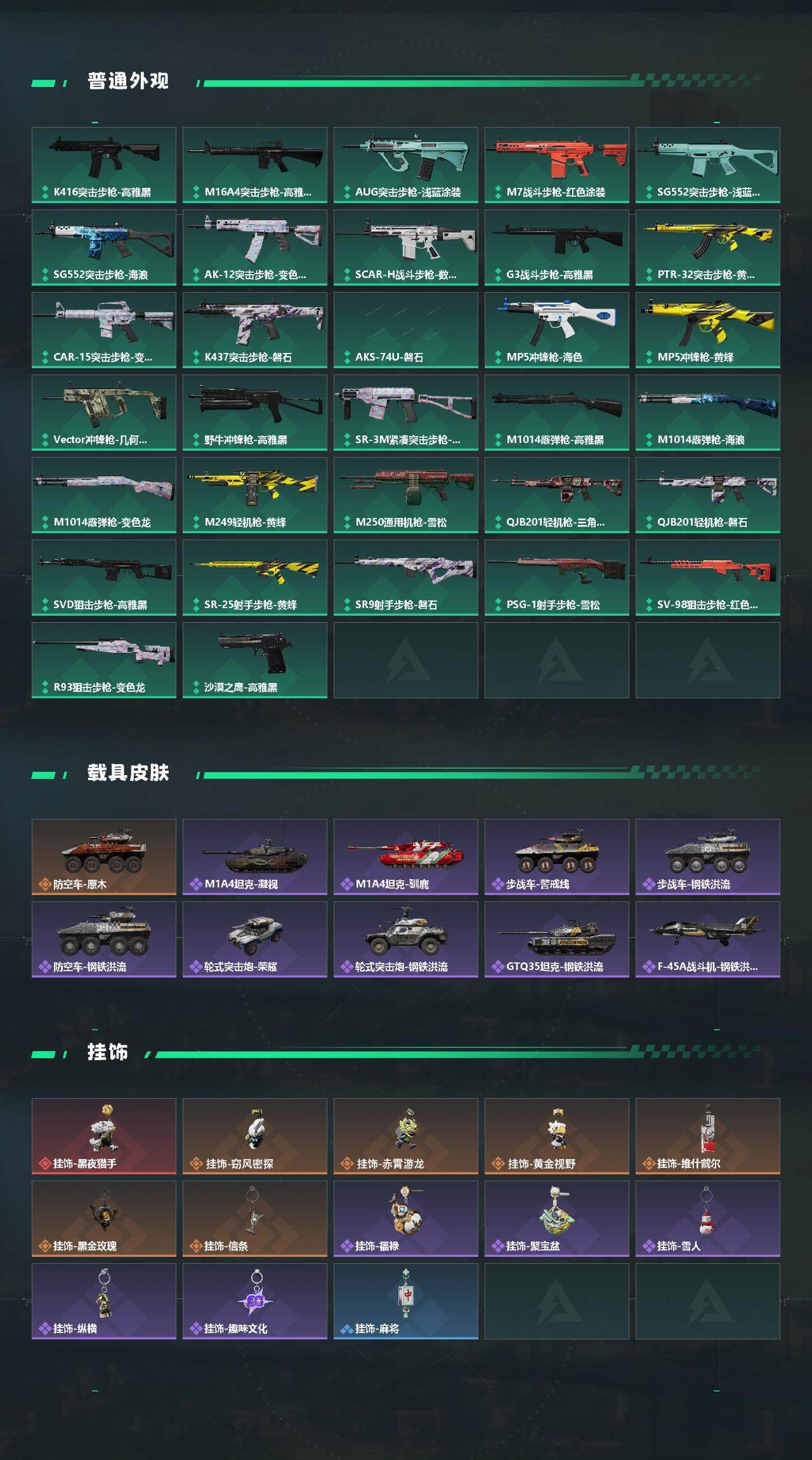【史诗外观】:QBZ95-1突击步枪-曙光,K416突击步枪-冬日风情,AUG突击步枪-蝮蛇,M7战斗步枪-百步穿杨,G3战斗步枪-流沙送葬,AS Val突击步枪-百步穿杨,Vector冲锋枪-百步穿杨,Vector冲锋枪-异域战争,S12K霰弹枪-曙光,SVD狙击步枪-阿萨拉工艺,M14射手步枪-工业狂潮,M700狙击步枪-百步穿杨,M700狙击步枪-哈夫克警备,AWM狙击步枪-流沙送葬