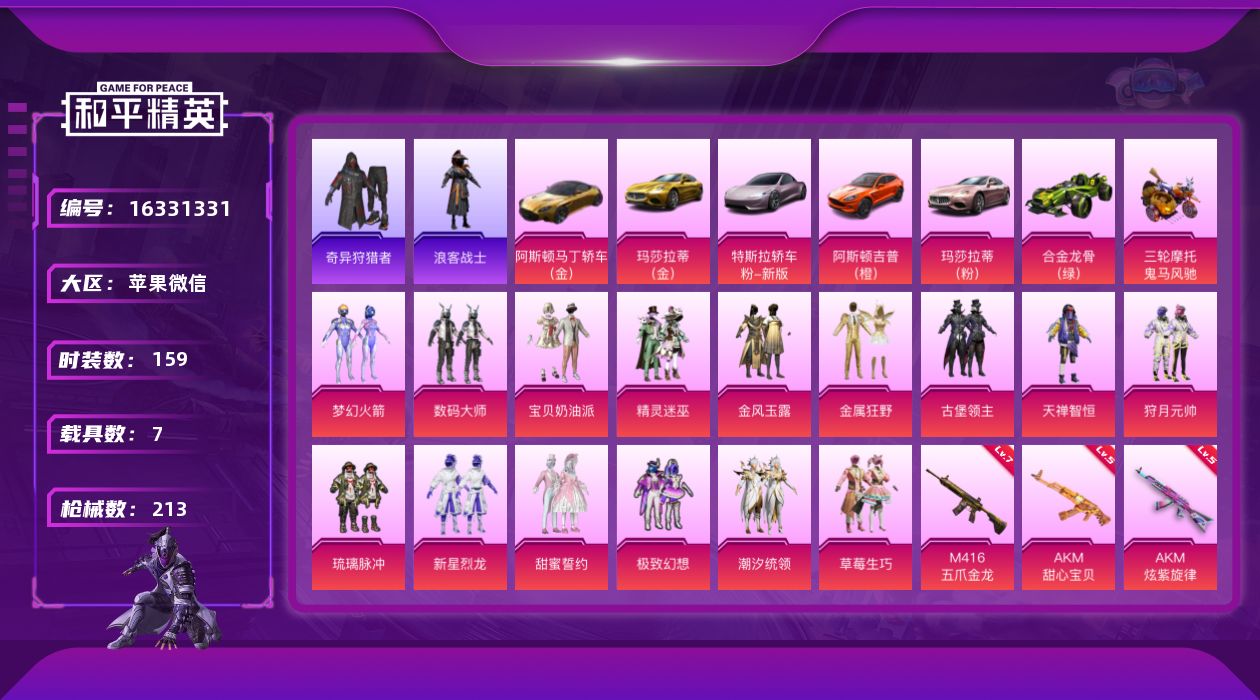 [16331331]【特价出售/店主推荐】苹果,微信-15粉装-10特效枪-7载具-4粉色飞行器-91361热力值-4王牌印记-159套装-213枪皮