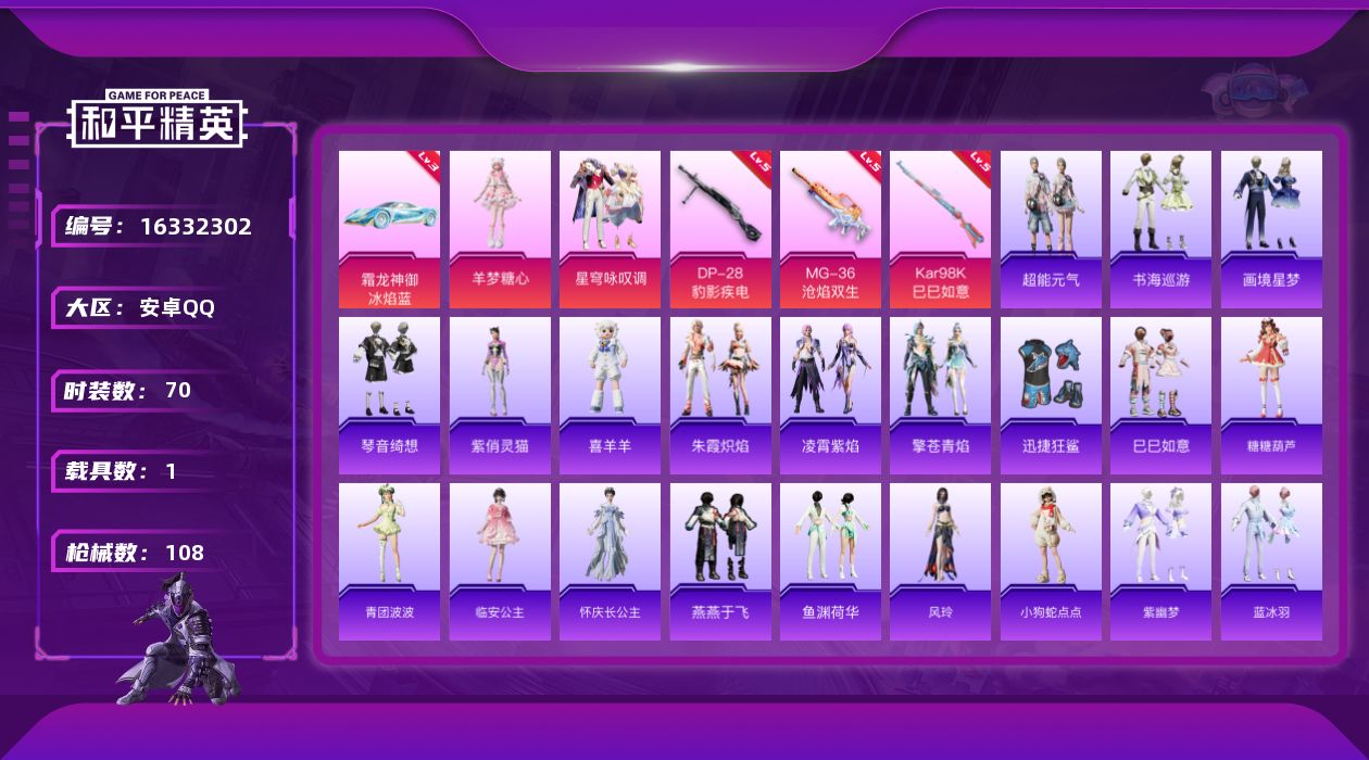 [16332302]【特价出售/店主推荐】安卓 手Q-2粉装-3特效枪-1载具-2粉色飞行器-3.6w热力值-3王牌印记-70套装-108枪皮 【红色载具】:霜龙神御(冰焰蓝)(三级) 【粉色套装】:粉装-星穹咏叹调,角色-羊梦糖心 【粉色枪皮等级】:Kar98K-巳巳如意(五级),DP-28-豹影疾电(五级),MG-36-沧焰双生(五级) 【粉色载具】:霜龙神御(冰焰蓝) 【粉色枪皮】:Kar98K-巳巳如意,DP-28-豹影疾电,MG-36-沧焰双生 【粉色飞行器】:暮色之舞飞行器 【粉色降落伞】:垂柳戏鸭降落伞,月影灵韵降落伞,鬼刀降落伞,星穹咏叹调降落伞,宁雨蝶降落伞,荧海星豚降落伞,灵猫魔法师降落伞,无垠阁降落伞,喜羊羊与灰太狼降落伞,异瞳寒姬降落伞,炫彩糖果降落伞,暮色玫影降落伞 【稀有套装】:套装-巳巳如意,套装-超能元气,套装-雪国风尚,套装-糖糖葫芦,套装-青团波波,角色-临安公主,角色-怀庆长公主,套装-燕燕于飞,套装-鱼渊荷华,角色-风玲,玩偶服-小狗蛇点点,套装-紫幽梦,套装-蓝冰羽,套装-星渊小夜曲,套装-霓虹热舞,套装-彩虹兔,套装-云朵鹅,套装-雪绒豹,角色-乐音,角色-绛羽幽主,套装-朱霞炽焰,套装-凌霄紫焰,套装-擎苍青焰,玩偶服-喜羊羊,角色-紫俏灵猫,套装-书海巡游,套装-画境星梦,套装-琴音绮想,套装-炫彩糖果 【稀有枪皮】:AUG-冰晶雪宝,AKM-破晓战魂,SCAR-L-玉兔迎春,SCAR-L-净心行者,M416-糯团青竹,M416-蓝色火焰,GROZA-彩虹符号,GROZA-暮色玫影,M762-云朵鹅,AC-VAL-天降萌叽,蜜獾-绯穹魔姬,ACE32-画境星梦,ARX-凌霄紫焰,UZI-啾咪啾咪,UMP45-蓝色火焰,MP5K-画境星梦,JS9-凌霄紫焰,P90-飞驰魅影,P90-宁雨蝶,P90-巳巳如意,Kar98k-最终圣卫者,VSS-彩虹符号,Mini14-耀粉歌者,AMR-喜羊羊与灰太狼,SVD-云朵鹅,M1加兰德-画境星梦,S686-巳巳如意,S12K-玩趣呆呆,DBS-荧海星豚,DBS-净心行者,AA12-G-画境星梦,SPAS-12-云朵鹅,M249-彩虹符号,M249-破晓战魂,MG3-幻世战舞者,MG-36-凌霄紫焰,P92-凌霄紫焰,沙漠之鹰-云朵鹅,大砍刀-云朵鹅,大砍刀-鬼刀,撬棍-冷漠罗丽,平底锅-凌霄紫焰,平