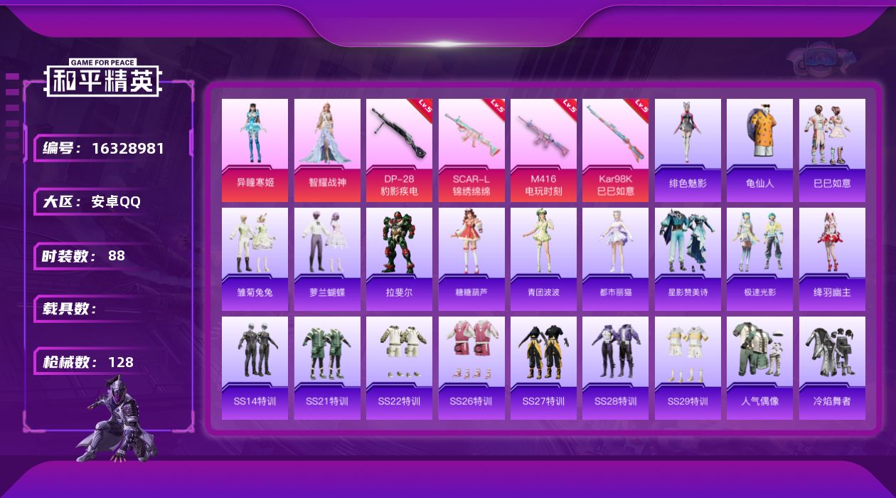 [16328981]【特价出售/店主推荐】安卓 手Q-2粉装-4特效枪-0载具-2粉色飞行器-34312热力值-9王牌印记-88套装-128枪皮 【热门品类】:套装-龟仙人 【粉色套装】:角色-智耀战神,角色-异瞳寒姬 【粉色枪皮等级】:SCAR-L-锦绣绵绵(五级),M416-电玩时刻(五级),Kar98K-巳巳如意(五级),DP-28-豹影疾电(五级) 【粉色枪皮】:SCAR-L-锦绣绵绵,M416-电玩时刻,Kar98K-巳巳如意,DP-28-豹影疾电 【粉色飞行器】:百变魔方飞行器 【粉色降落伞】:碧影闪光降落伞,音爆索尼克降落伞,第五大道降落伞,江南烟雨降落伞,英伦信使降落伞,时光之吻降落伞,荧海星豚降落伞,极意拳锋降落伞,炫彩糖果降落伞 【稀有套装】:套装-龟仙人,套装-巳巳如意,套装-雏菊兔兔,套装-萝兰蝴蝶,角色-拉斐尔,套装-糖糖葫芦,套装-青团波波,角色-都市丽猫,套装-星影赞美诗,套装-极速光影,角色-绛羽幽主,角色-绯色魅影,套装-炫彩糖果 【稀有枪皮】:AKM-夜灯,AKM-破晓战魂,AKM-霓虹街区,AKM-极光猎影,M16A4-幻世战舞者,M16A4-莲影清波,SCAR-L-夜灯,SCAR-L-玉兔迎春,SCAR-L-红色方程式,M416-糯团青竹,M416-红色方程式,M416-蓝色火焰,GROZA-恐龙拽拽,AUG-耀粉歌者,QBZ-银河战甲,M762-天降萌叽,Mk47-炫光之旅,蜜獾-绯穹魔姬,UZI-啾咪啾咪,UZI-天降萌叽,UZI-幻影飞狐,UMP45-夜灯,UMP45-生命誓言,UMP45-极意拳锋,Vector-焰鹰斗篷,Vector-彩虹符号,P90-巳巳如意,Kar98K-六号树人,Kar98K-彩虹符号,AWM-焰鹰斗篷,AMR-鬼刀,MK20-H-樱桃泡泡,M200-六号稻草人,S686-彩虹符号,S686-生命誓言,S686-巳巳如意,S1897-荧海星豚,S12K-玩趣呆呆,S12K-夜灯,S12K-蓝晶绮麟,S12K-智耀战神,DBS-焰鹰斗篷,DBS-圣堂之誓,DBS-彩虹符号,M249-百万伏特,M249-破晓战魂,M249-莲影清波,DP-28-焰鹰斗篷,短管霰弹-星穹咏叹调,平底锅-咒蚀之裁,破片手榴弹-巳巳如意 【其他套装】:套装-SS14特训,套装-SS21特训,套装-SS22特训,套装-SS26特训,套装-S