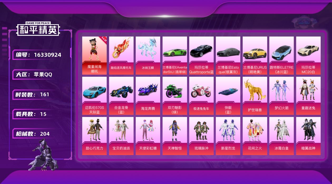 [16330924]【特价出售/店主推荐】苹果 手Q-1神装-36粉装-14特效枪-15载具-16粉色飞行器-101260热力值-7王牌印记-161套装-204枪皮
