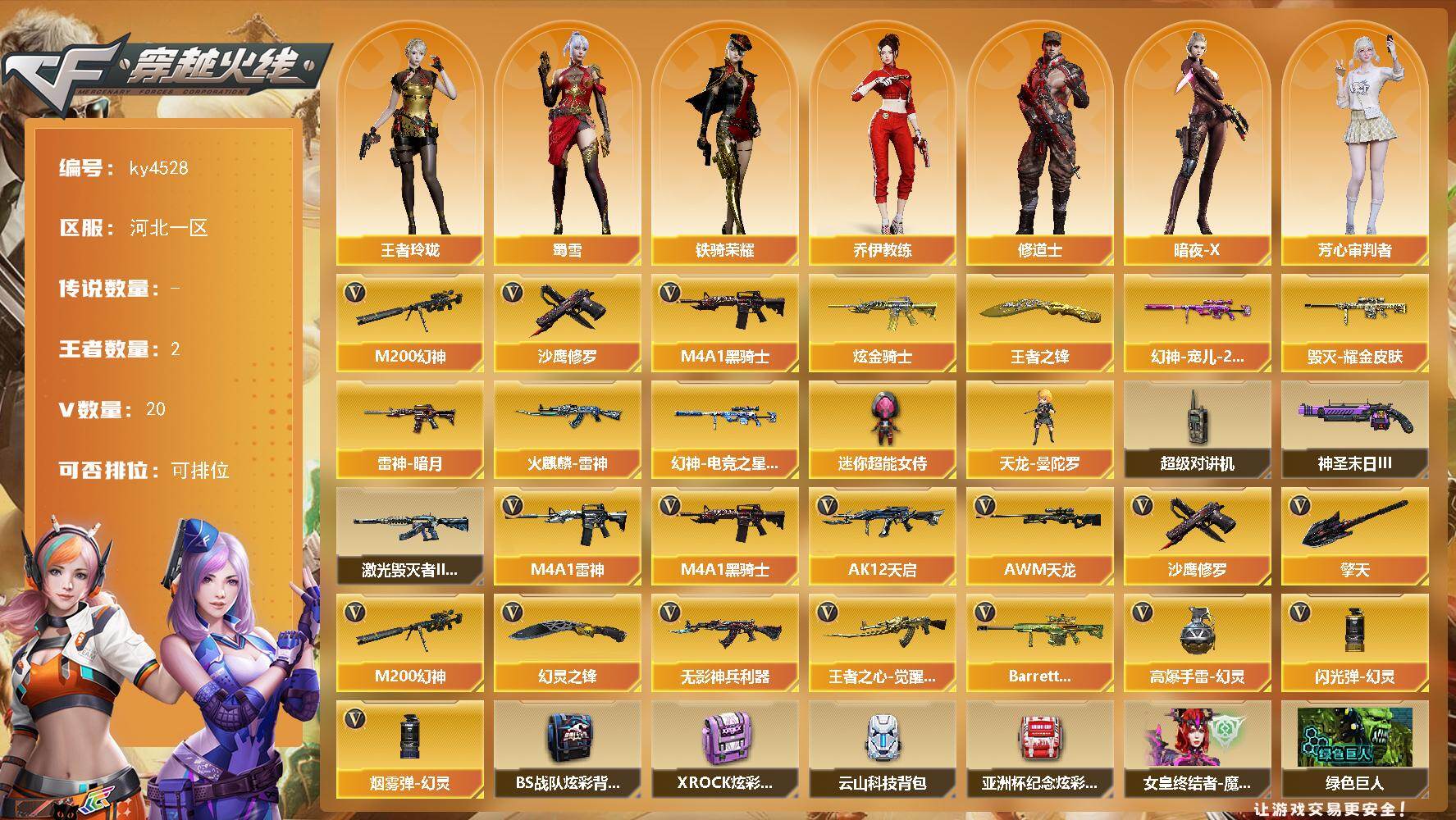 [16755016]河北一区-20V-2王者-1炫金 【热门武器】:M200-幻神,M4A1-黑骑士,沙鹰-修罗*2 【王者炫金武器】:王者之锋,炫金骑士 【皮肤】:幻神-宠儿-2021MVP,幻神-电竞之星 皮肤,雷神-暗月,火麒麟-雷神,毁灭耀金皮肤 【角色】:王者玲珑,乔伊教练,修道士,暗夜-X,芳心审判者,嘉年华灵狐,娟娟,灵狐者-X,灵狐者-黄金海岸,曼陀罗-X,潘多拉-X,潘多拉-甜心教官,蜀雪,铁骑荣耀,维纳斯,雪莉杨-摸金校尉,夜玫瑰-宠粉 【人偶武器】:天龙-曼陀罗,迷你超能女侍 【暴走生化】:超级对讲机 【挑战大师】:激光毁灭者III-白马银枪,神圣爆裂者-末日III 【英雄级武器】:M4A1-雷神,M4A1-黑骑士,AK12-天启,无影-神兵利器,王者之心-觉醒版,AWM-天龙,M200-幻神,沙鹰-修罗*2,擎天,幻灵之锋,高爆手雷-幻灵,闪光弹-幻灵*2,烟雾弹-幻灵,Barrett-碧霄极光 【道具】:BS战队炫彩背包,XROCK炫彩背包,云山科技背包,亚洲杯纪念炫彩背包,哔哩哔哩名片,女皇终结者-魔龙之吻,绿色巨人,灵魂忍者,迷雾幽灵,夺命之镰,防化服*3,金色流光-枪王排位*2,星辰流光-枪王排位,枪王排位28赛季金色流光,炽雪表情,动感闪耀表情,EP战队击杀图标,防弹头盔*6,防弹衣*5,C4工具钳*4,手雷包*3 【特殊枪械】:1黑骑士