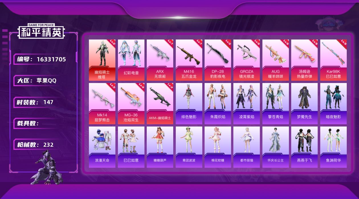 [16331705]【特价出售/店主推荐】苹果 手Q-1神装-1粉装-10特效枪-0载具-2粉色飞行器-69338热力值-12王牌印记-147套装-232枪皮