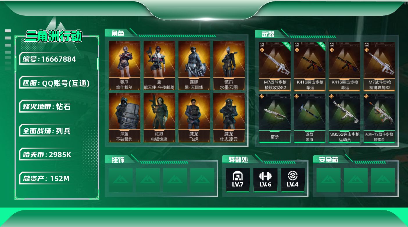 [16667884]【特价出售/店主推荐】152m总资产-2985k哈伏币-60烽火等级-钻石-50战场等级-列兵 【干员外观】:骇爪-水墨云图,露娜-黑·天际线,蛊-能天使午夜邮差,骇爪-维什戴尔,威龙-壮志凌云,威龙-飞虎,蜂医-送葬人·无题密令,无名-夜鹰,深蓝-不破誓约,红狼-电锯惊魂 【近战皮肤】:近战-信条,近战-黑海,近战-黑鹰 【典藏外观】:K416突击步枪-命运,M7战斗步枪-棱镜攻势S2 【典藏外观成色】:K416突击步枪-命运(优品C),M7战斗步枪-棱镜攻势S2(优品S) 【传说外观】:M4A1突击步枪-阿米娅,AKM突击步枪-黎明警戒,ASh-12战斗步枪-鹅鸭杀,K416突击步枪-尖峰行动,M7战斗步枪-机动小队,SG552突击步枪-运动员,AK-12突击步枪-夜鹰,AK-12突击步枪-特斯拉线圈,SCAR-H战斗步枪-铁艺苍穹,SCAR-H战斗步枪-水墨云图,SCAR-H战斗步枪-启航,CAR-15突击步枪-阿米娅,AS Val突击步枪-动力风潮,腾龙突击步枪-黎明警戒,腾龙突击步枪-捞点薯条,K437突击步枪-极速狂飙,K437突击步枪-北极星,MP5冲锋枪-黑海,Vector冲锋枪-能天使-午夜邮差,UZI冲锋枪-特斯拉线圈,SMG-45冲锋枪-骑士,SR-3M紧凑突击步枪-特斯拉线圈,勇士冲锋枪-能天使-午夜邮差,QCQ171冲锋枪-鹅鸭杀,725双管霰弹枪-送葬人-无题密令,M250通用机枪-几何解构,M250通用机枪-骑士之心,QJB201轻机枪-黑海,QJB201轻机枪-鹅鸭杀,M14射手步枪-蛮荒,SR-25射手步枪-水墨云图,R93狙击步枪-维什戴尔,AWM狙击步枪-捞点薯条,G18-飞虎,G18-黎明警戒,93R-捞点薯条,复合弓-黑·天际线 【史诗外观】:SR-25射手步枪-天命,M4A1突击步枪-特勤执行,AKM突击步枪-林中猎手,QBZ95-1突击步枪-曙光,QBZ95-1突击步枪-ACE,ASh-12战斗步枪-守夜人,ASh-12战斗步枪-无极限,M16A4突击步枪-竞赛选手,AUG突击步枪-战术迷彩,AUG突击步枪-蝮蛇,AUG突击步枪-特勤执行,SG552突击步枪-尖端治疗,SG552突击步枪-深海恐惧,SCAR-H战斗步枪-趣味贴纸,SCAR-H战斗步枪-国风,SCAR-H战斗步枪-猎鳄行动,SCAR-H战斗步枪-囚徒,G