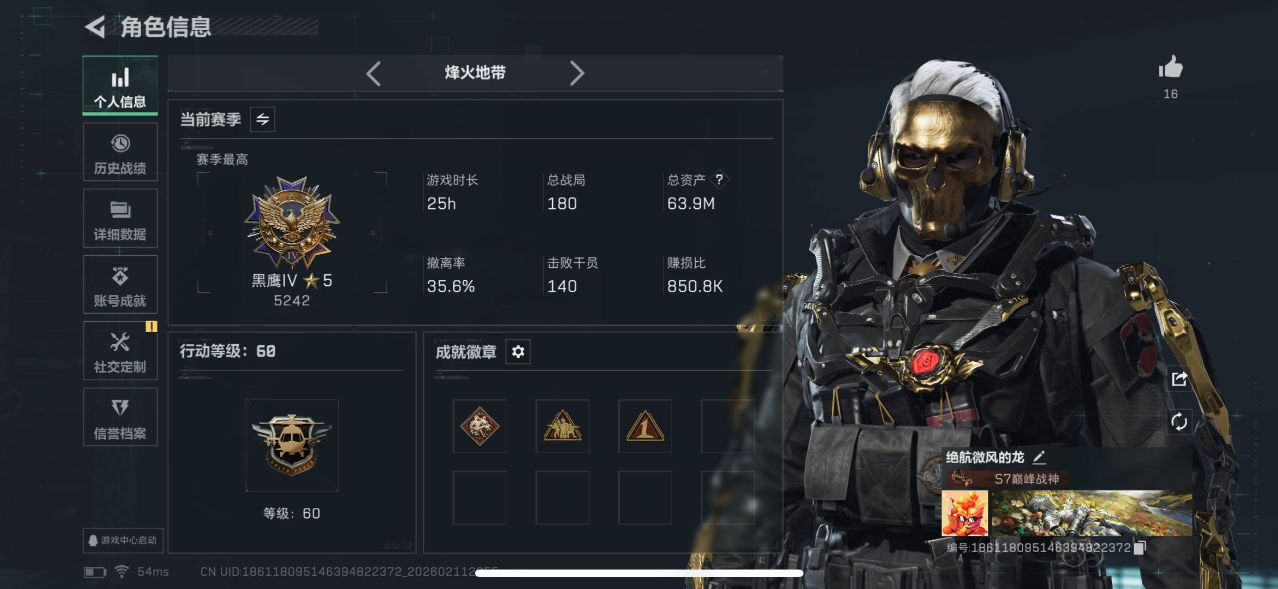 [16695444]【特价出售/店主推荐】63m总资产-20701k哈伏币-60烽火等级-黑鹰-1战场等级-无军衔