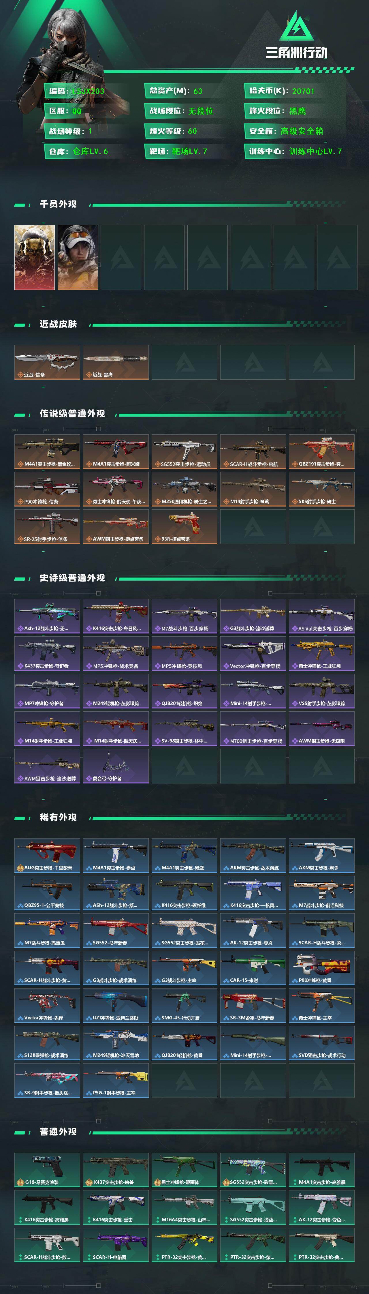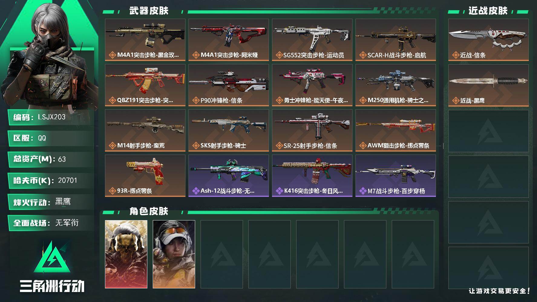 [16695444]【特价出售/店主推荐】63m总资产-20701k哈伏币-60烽火等级-黑鹰-1战场等级-无军衔 【干员外观】:红狼-蚀金玫瑰,露娜-金牌射手 【近战皮肤】:近战-信条,近战-黑鹰 【传说外观】:M4A1突击步枪-蚀金玫瑰,M4A1突击步枪-阿米娅,SG552突击步枪-运动员,SCAR-H战斗步枪-启航,腾龙突击步枪-捞点薯条,P90冲锋枪-信条,勇士冲锋枪-能天使-午夜邮差,M250通用机枪-骑士之心,M14射手步枪-蛮荒,SKS射手步枪-骑士,SR-25射手步枪-信条,AWM狙击步枪-捞点薯条,93R-捞点薯条 【史诗外观】:ASh-12战斗步枪-无极限,K416突击步枪-冬日风情,M7战斗步枪-百步穿杨,G3战斗步枪-流沙送葬,AS Val突击步枪-百步穿杨,K437突击步枪-守护者,MP5冲锋枪-战术竞备,MP5冲锋枪-竞技风,Vector冲锋枪-百步穿杨,勇士冲锋枪-工业狂潮,MP7冲锋枪-守护者,M249轻机枪-丛影谍踪,QJB201轻机枪-炽焰,Mini-14射手步枪-守护者,VSS射手步枪-丛影谍踪,M14射手步枪-工业狂潮, M14射手步枪-航天庆典,SV-98狙击步枪-林中猎手,M700狙击步枪-百步穿杨,AWM狙击步枪-无极限,AWM狙击步枪-流沙送葬,复合弓-守护者 【稀有外观】:AUG突击步枪-千里骏骨,M4A1突击步枪-零点,M4A1突击步枪-繁盛,AKM突击步枪-战术演练,AKM突击步枪-肃杀,QBZ95-1突击步枪-公平竞技,ASh-12战斗步枪-繁盛,K416突击步枪-碳纤维,K416突击步枪-一帆风顺,M7战斗步枪-前沿科技,M7战斗步枪-捣蛋鬼,SG552突击步枪-马年新春,SG552突击步枪-贴花艺术,AK-12突击步枪-零点,SCAR-H战斗步枪-荣耀列队,SCAR-H战斗步枪-黄昏,G3战斗步枪-战术演练,G3战斗步枪-主宰*2,CAR-15突击步枪-来财,P90冲锋枪-黄昏,Vector冲锋枪-先锋,UZI冲锋枪-亚特兰蒂斯,SMG-45-行动开启,SR-3M紧凑突击步枪-马年新春,勇士冲锋枪-主宰,S12K霰弹枪-战术演练,M249轻机枪-冰天雪地,QJB201轻机枪-黄昏,Mini-14射手步枪-荣耀列队,SVD狙击步枪-战术行动,SR-9射手步枪-街头涂鸦,PSG-1射手步枪-主宰 【普通外观】:G18-马赛克涂装