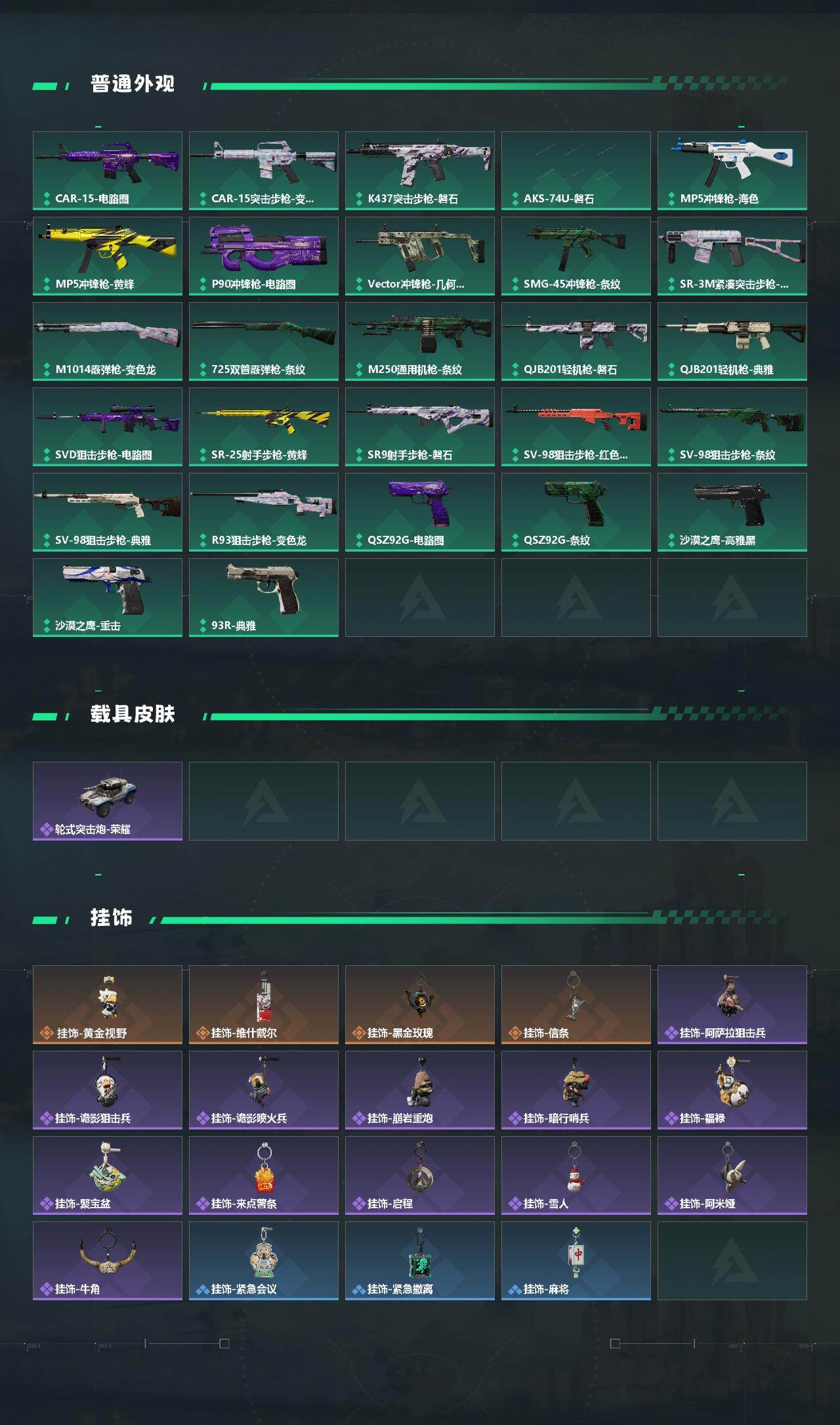 【稀有外观】:AUG突击步枪-千里骏骨,M4A1突击步枪-零点,M4A1突击步枪-繁盛,AKM突击步枪-战术演练,AKM突击步枪-肃杀,QBZ95-1突击步枪-公平竞技,ASh-12战斗步枪-繁盛,K416突击步枪-碳纤维,K416突击步枪-一帆风顺,M7战斗步枪-前沿科技,M7战斗步枪-捣蛋鬼,SG552突击步枪-马年新春,SG552突击步枪-贴花艺术,AK-12突击步枪-零点,SCAR-H战斗步枪-荣耀列队,SCAR-H战斗步枪-黄昏,G3战斗步枪-战术演练,G3战斗步枪-主宰*2,CAR-15突击步枪-来财,P90冲锋枪-黄昏,Vector冲锋枪-先锋,UZI冲锋枪-亚特兰蒂斯,SMG-45-行动开启,SR-3M紧凑突击步枪-马年新春,勇士冲锋枪-主宰,S12K霰弹枪-战术演练,M249轻机枪-冰天雪地,QJB201轻机枪-黄昏,Mini-14射手步枪-荣耀列队,SVD狙击步枪-战术行动,SR-9射手步枪-街头涂鸦,PSG-1射手步枪-主宰