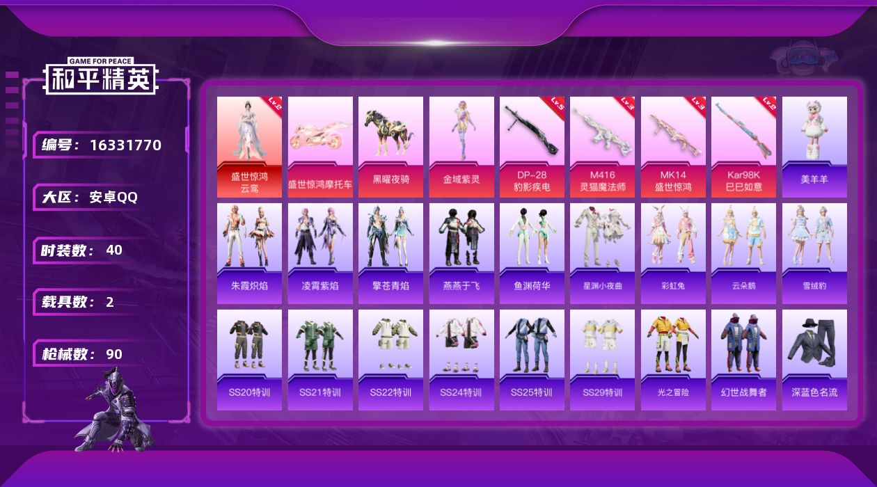 [16331770]安卓 手Q-1神装-1粉装-4特效枪-2载具-2粉色飞行器-26140热力值-4王牌印记-40套装-90枪皮 【红色神装等级】:盛世惊鸿-云鸾(二级) 【红色角色神装】:盛世惊鸿-云鸾 【粉色套装】:角色-金域紫灵 【粉色枪皮等级】:M416-灵猫魔法师(三级),Kar98K-巳巳如意(二级),Mk14-盛世惊鸿(三级),DP-28-豹影疾电(五级) 【粉色载具】:盛世惊鸿摩托车,黑曜夜骑 【粉色枪皮】:M416-灵猫魔法师,Kar98K-巳巳如意,Mk14-盛世惊鸿,DP-28-豹影疾电 【粉色飞行器】:凤舞九天飞行器,灵猫魔法师飞行器 【粉色降落伞】:洛神天依降落伞,千金淑猫降落伞,盛世惊鸿降落伞,荧海星豚降落伞,灵猫魔法师降落伞,绯穹魔姬降落伞,异瞳寒姬降落伞 【稀有套装】:套装-燕燕于飞,套装-鱼渊荷华,套装-星渊小夜曲,套装-彩虹兔,套装-云朵鹅,套装-雪绒豹,套装-朱霞炽焰,套装-凌霄紫焰,套装-擎苍青焰,玩偶服-美羊羊 【稀有枪皮】:AKM-破晓战魂,AKM-灵猫魔法师,M16A4-幻世战舞者,SCAR-L-炫彩节奏,SCAR-L-红色方程式,M416-绯红前夜,M416-蓝色火焰,AUG-天降萌叽,AUG-耀粉歌者,M762-天降萌叽,M762-绯红前夜,M762-云朵鹅,AC-VAL-天降萌叽,蜜獾-天降萌叽,蜜獾-绯穹魔姬,Famas-桃粉嫣然,ARX-凌霄紫焰,UZI-红色方程式,UZI-盛世惊鸿,UMP45-生命誓言,UMP45-蓝色火焰,Vector-彩虹符号,汤姆逊-灵猫魔法师,JS9-凌霄紫焰,Kar98K-红色方程式,M24-炫彩节奏,AWM-盛世惊鸿,Mini14-炫彩节奏,Mini14-耀粉歌者,Mini14-绯穹魔姬,MK20-H-樱桃泡泡,SVD-云朵鹅,S1897-炫彩节奏,S12K-玩趣呆呆,S12K-幻世战舞者,SPAS-12-云朵鹅,M249-糯团青竹,MG3-幻世战舞者,MG3-桃粉嫣然,MG-36-凌霄紫焰,P92-凌霄紫焰,沙漠之鹰-云朵鹅,大砍刀-云朵鹅,大砍刀-盛世惊鸿,撬棍-灵猫魔法师,平底锅-凌霄紫焰 【其他套装】:套装-SS20特训,套装-SS21特训,套装-SS22特训,套装-SS24特训,套装-SS25特训,套装-SS29特训,套装-光之冒险,套装-幻世战舞者,套装-深蓝色名流,套装-猎鹰,套装-