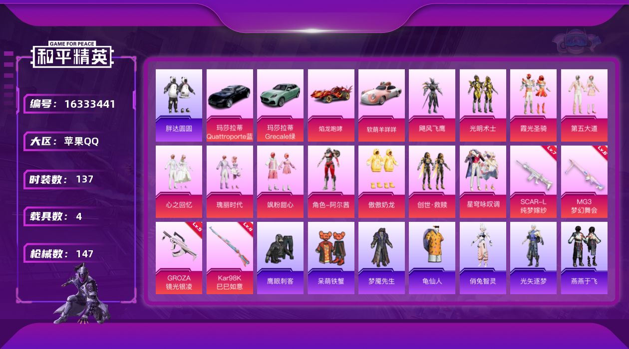 [16333441]【特价出售/店主推荐】苹果 手Q-11粉装-4特效枪-4载具-1粉色飞行器-57291热力值-11王牌印记-137套装-147枪皮 【热门品类】:套装-胖达圆圆,套装-龟仙人 【粉色套装】:粉装-飓风飞鹰,粉装-光明术士,粉装-霞光圣骑,粉装-第五大道,粉装-心之回忆,粉装-瑰丽时代,粉装-飒粉甜心,角色-阿尔茜,粉装-傲傲奶龙,套装-创世·救赎,粉装-星穹咏叹调 【粉色枪皮等级】:SCAR-L-纯梦嫁纱(七级),GROZA-镜光银凌(五级),Kar98K-巳巳如意(四级),MG3-梦幻舞会(六级) 【粉色载具】:玛莎拉蒂Quattroporte(夜幕蓝),玛莎拉蒂Grecale(薄荷绿),焰龙咆哮,软萌羊咩咩,僚机-萌兔起飞 【粉色枪皮】:SCAR-L-纯梦嫁纱,GROZA-镜光银凌,Kar98K-巳巳如意,MG3-梦幻舞会 【粉色飞行器】:纯梦嫁纱飞行翼 【粉色降落伞】:至尊龙雀降落伞,梦幻火箭降落伞,垂柳戏鸭降落伞,暗夜鎏金降落伞,仲夏莫吉托降落伞,梦幻舞会降落伞,天星战神降落伞,电糖天使降落伞,星穹咏叹调降落伞,极意拳锋降落伞 【稀有套装】:套装-龟仙人,套装-雪国风尚,角色-俏兔智灵,角色-光矢逐梦,套装-燕燕于飞,套装-鱼渊荷华,角色-风玲,玩偶服-小狗蛇点点 【稀有枪皮】:AKM-彩虹符号,AKM-影袭,AKM-破晓战魂,AKM-虎虎生威,AKM-霓虹街区,M16A4-幻世战舞者,M16A4-红色方程式,SCAR-L-炫彩节奏,SCAR-L-玉兔迎春,SCAR-L-甜蜜誓约,SCAR-L-红色方程式,M416-糯团青竹,M416-红色方程式,M416-蓝色火焰,GROZA-彩虹符号,GROZA-影袭,GROZA-懵萌河马,GROZA-田园牧歌,AUG-天降萌叽,AUG-耀粉歌者,M762-天星战神,M762-天降萌叽,Mk47-妙红点点,G36C-懵萌河马,AC-VAL-天降萌叽,AC-VAL-快闪甜心,蜜獾-垂柳戏鸭,蜜獾-天降萌叽,蜜獾-娇憨猪猪,UZI-啾咪啾咪,UZI-天降萌叽,UZI-娇憨猪猪,UZI-影袭,UZI-红色方程式,UZI-月影灵韵,UMP45-仲夏莫吉托,UMP45-涂山之恋,UMP45-生命誓言,UMP45-蓝色火焰,Vector-焰鹰斗篷,Vector-田园牧歌,汤姆逊-天降萌叽,汤姆逊-炫彩节奏,汤姆逊-耀粉歌者,野牛-