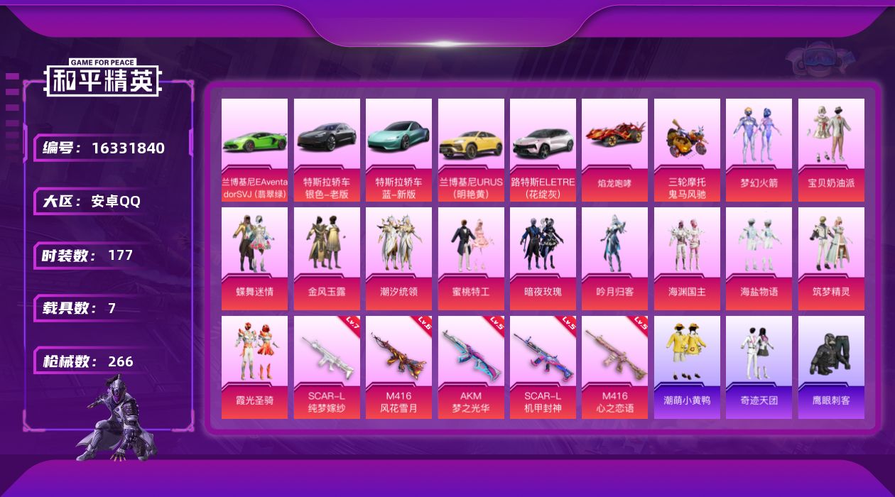 [16331840]【特价出售/店主推荐】安卓 手Q-12粉装-5特效枪-7载具-6粉色飞行器-95983热力值-11王牌印记-177套装-266枪皮【热门品类】:粉装-梦幻火箭,套装-浪漫天命,套装-龟仙人,套装-潮萌小黄鸭,套装-暗影哥特【粉色套装】:粉装-宝贝奶油派,粉装-蝶舞迷情,粉装-梦幻火箭,粉装-金风玉露,粉装-潮汐统领,粉装-蜜桃特工,粉装-暗夜玫瑰,粉装-吟月归客,粉装-海渊国主,粉装-海盐物语,粉装-筑梦精灵,粉装-霞光圣骑【粉色枪皮等级】:AKM-梦之光华(五级),SCAR-L-机甲封神(五级),SCAR-L-纯梦嫁纱(七级),M416-心之恋语(五级),M416-风花雪月(六级)【粉色载具】:特斯拉Model 3(冷光银),特斯拉Roadster(水滴蓝),兰博基尼Aventador SVJ(翡翠绿),兰博基尼URUS(明艳黄),路特斯ELETRE(花绽灰),焰龙咆哮,鬼马风驰【粉色枪皮】:AKM-梦之光华,SCAR-L-机甲封神,SCAR-L-纯梦嫁纱,M416-心之恋语,M416-风花雪月【粉色飞行器】:春暖花开飞行器,梦幻火箭飞行器,炫紫旋律飞行器,古堡领主飞行器,风花雪月飞行器,萌物绒绒飞行器