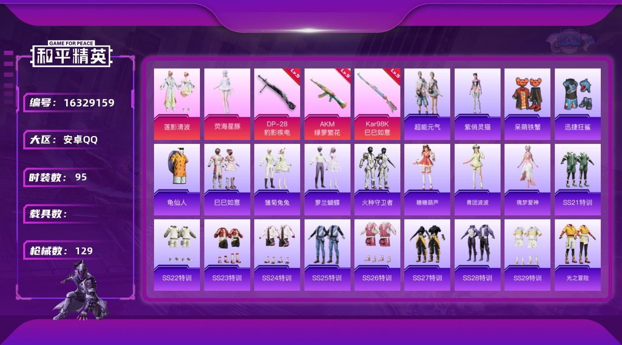 [16329159]【特价出售/店主推荐】 安卓 手Q-2粉装-3特效枪-0载具-1粉色飞行器-35367热力值-4王牌印记-95套装-129枪皮【热门品类】:套装-龟仙人【粉色套装】:粉装-莲影清波,角色-荧海星豚【粉色枪皮等级】:AKM-绿萝繁花(五级),Kar98K-巳巳如意(五级),DP-28-豹影疾电(五级)【粉色枪皮】:AKM-绿萝繁花,Kar98K-巳巳如意,DP-28-豹影疾电