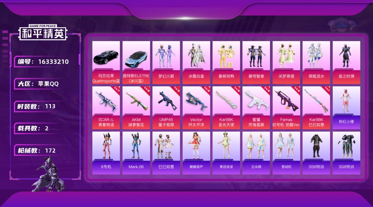 [16333210]【店主推荐捡漏号!可直接换绑】苹果 手Q-7粉装-8特效枪-2载具-3粉色飞行器-53877热力值-5王牌印记-113套装-172枪皮【热门品类】:粉装-梦幻火箭,套装-粉红小猪,角色-8号机,角色-Mark.06【粉色套装】:粉装-梦幻火箭,粉装-冰霜白皇,粉装-垂柳戏鸭,粉装-碧穹智者,粉装-闲梦青缨,粉装-银瓶流水,角色-宙之时溯【粉色枪皮等级】:AKM-绿萝繁花(五级),SCAR-L-青春物语(七级),蜜獾-荧海星豚(四级),Famas-初号机 觉醒Ver.(四级),UMP45-量子极限(五级),Vector-环太平洋(五级),Kar98K-圣光天使(五级),Kar98K-巳巳如意(一级)【粉色载具】:路特斯ELETRE(冰川蓝),玛莎拉蒂Quattroporte(夜幕蓝)【粉色枪皮】:AKM-绿萝繁花,SCAR-L-青春物语,蜜獾-荧海星豚,Famas-初号机 觉醒Ver.,UMP45-量子极限,Vector-环太平洋,Kar98K-圣光天使,Kar98K-巳巳如【粉色飞行器】:梦幻火箭飞行器,太空嘟嘟飞行器,拂晓神骑飞行器
