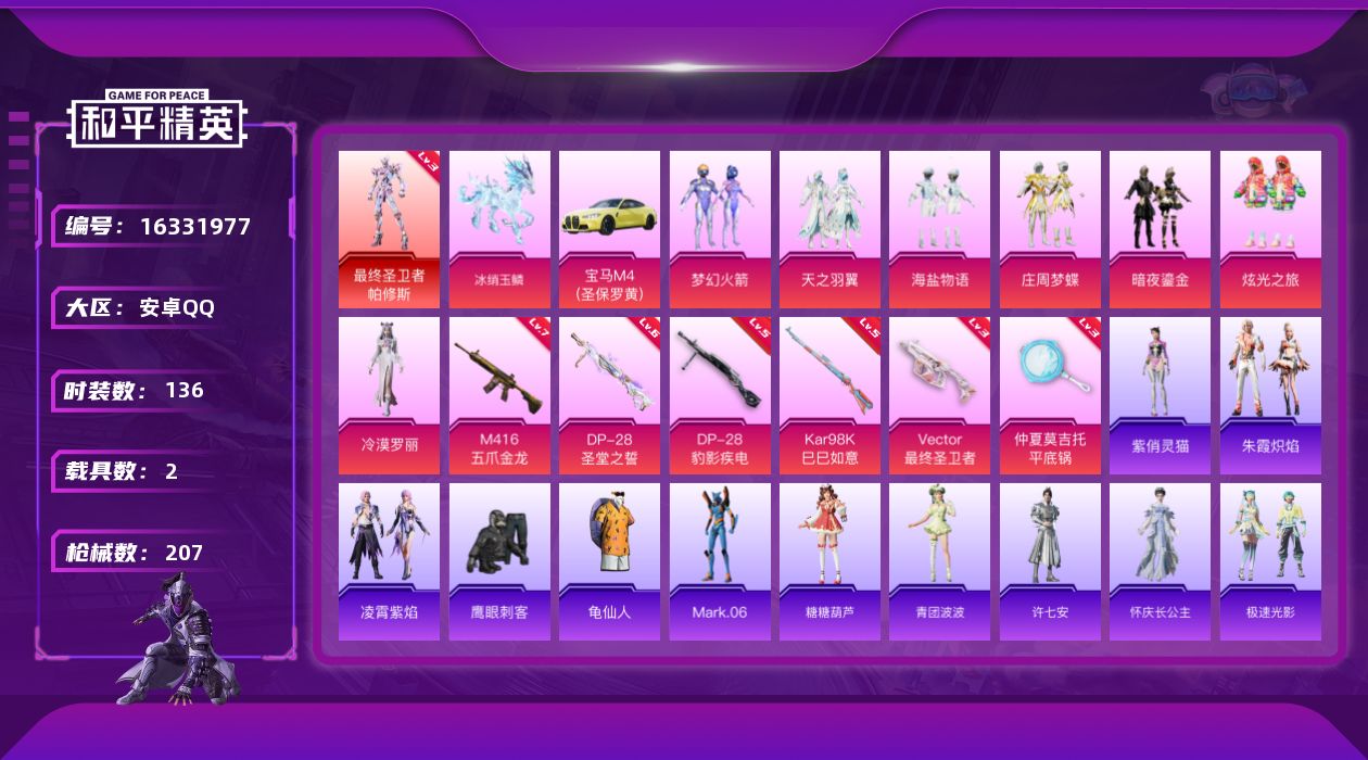 [16331977]【特价出售/店主推荐】安卓 手Q-1神装-8粉装-6特效枪-2载具-4粉色飞行器-7w热力值-6王牌印记-136套装-207枪皮